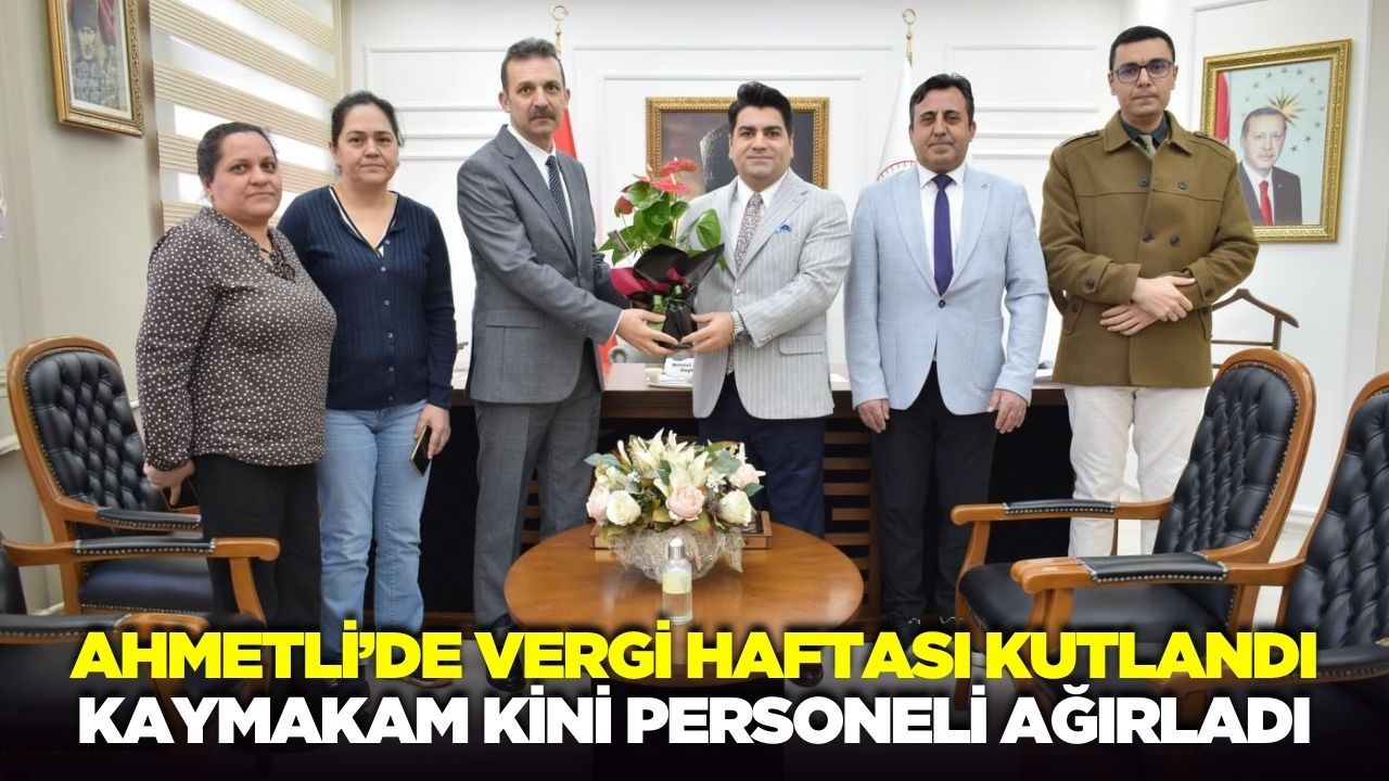 Ahmetli Kaymakamı Mehmet Kaan Kini, her yıl Şubat ayının son haftasında kutlanan "Vergi Haftası" dolayısıyla anlamlı bir ziyarete ev sahipliği yaptı. Ahmetli Vergi Dairesi Müdürü Ökkeş Kılıç ve beraberindeki personeli makamında kabul eden Kaymakam Kini, tüm vergi dairesi çalışanlarının haftasını kutlayarak, başarılar diledi.