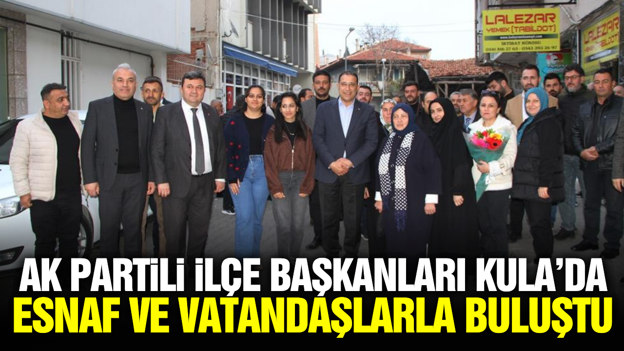 AK Parti Manisa İl Başkanlığı, Kula'da gerçekleştirdiği ilçe başkanları toplantısının ardından yoğun bir ziyaret programı gerçekleştirdi. AK Parti Manisa İl Başkanı Süleyman Turgut, Kula İlçe Başkanı Nejat Gülmez ve 16 ilçe başkanından oluşan heyet, öncelikle Kula ilçe merkezinde esnaf ziyaretleri gerçekleştirdi. Heyet, iş yerlerini tek tek gezerek esnafın talep ve görüşlerini dinledi.