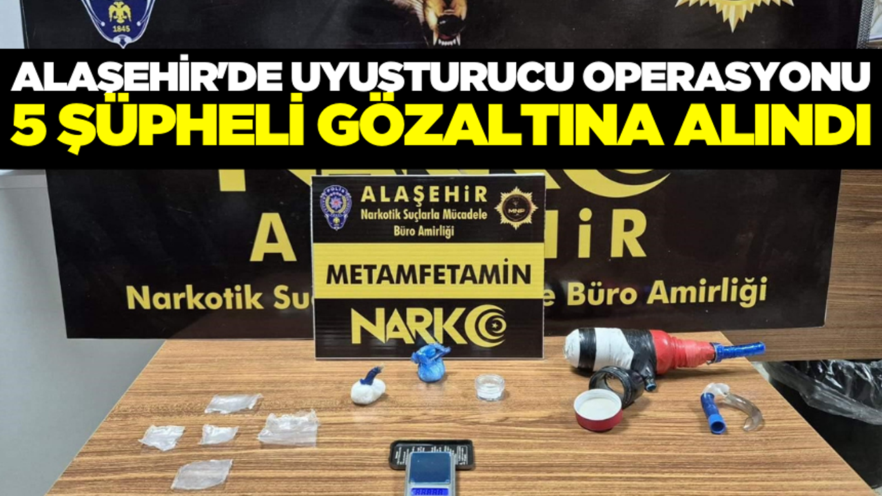 Manisa İl Emniyet Müdürlüğü Narkotik Suçlarla Mücadele Şube Müdürlüğü, Alaşehir ve Turgutlu NSM Büro Amirliklerince, “Uyuşturucu veya Uyarıcı Madde İmal ve Ticareti Yapan, Aracılık Eden” şahısların yakalanmalarına ve suç unsurların tespitine yönelik sokak ve analiz çalışmaları kapsamında 25 Eylül tarihinde Alaşehir ve Turgutlu ilçelerinde yapılan operasyonda toplamda şüpheli 5 şahıs yakalandı. P.K. (22), H.G. (25), E.E (25), M.Y (22) ve B.Ü. (36) isimli şüpheli şahısların ikamet ve üst aramalarında; 1 adet hassas terazi, 13 parça halinde 38,67 gram metamfetamin maddesi, 0,86 gram skunk maddesi, 2 adet uyuşturucu içme aparatı ele geçirildi.
