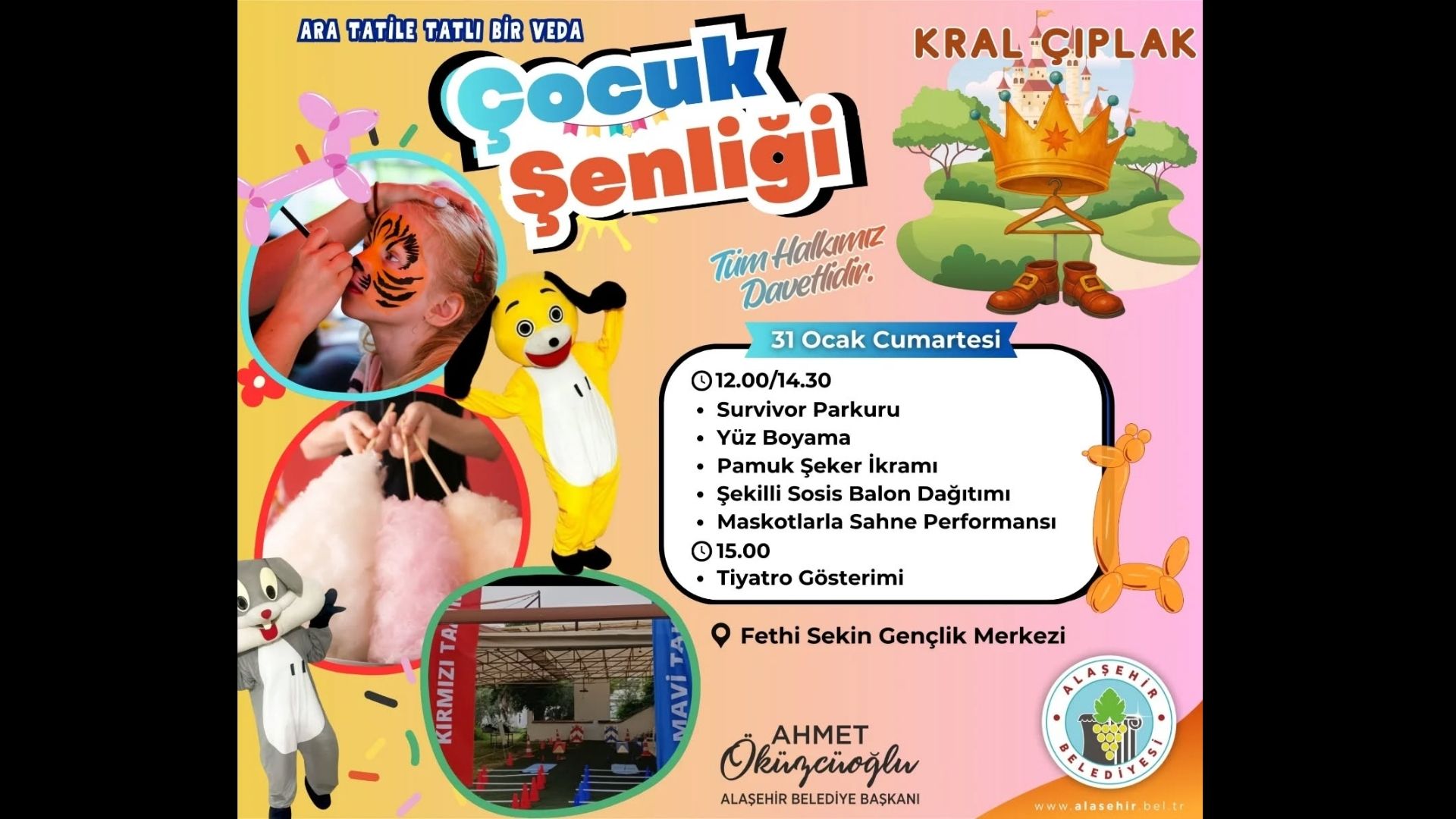 Alaşehir'de 31 Ocak Cumartesi günü Fethi Sekin Gençlik Merkezi'nde gerçekleştirilecek olan "Çocuk Şenliği" saat 12.30 ile 14.30 arasında çocuklara unutulmaz anlar yaşatacak.