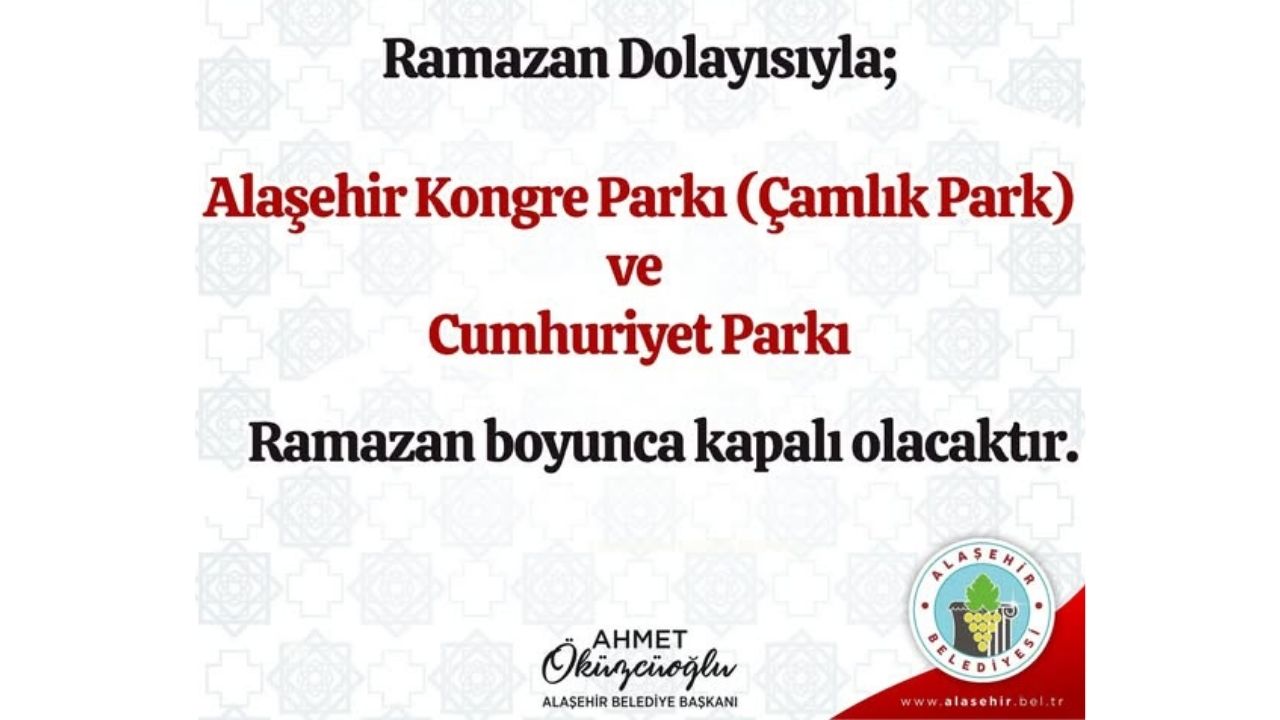 Alaşehir Belediyesi tarafından yapılan paylaşımda, "Ramazan Ayı dolayısıyla Alaşehir Kongre Parkı ve Cumhuriyet Parkımız apalı olacaktır. Parkların bayram sonrasında yeniden ziyarete açılması bekleniyor" dendi.
