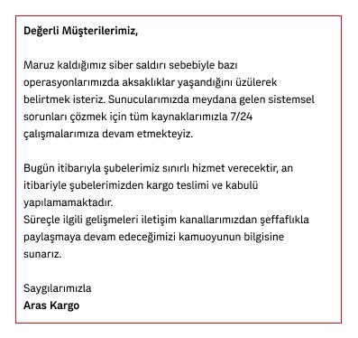 Aras Kargo, hem internet sitesi hem de mobil uygulamaya erişimi tamamen durduran sorunun, sunuculara yönelik siber güvenlik saldırısından kaynaklandığını doğruladı. Bilgi Teknolojileri ekiplerinin, dış güvenlik danışmanlarıyla birlikte kesintinin kaynağını inceleyip iyileştirme çalışması yürüttüğü bildirildi.