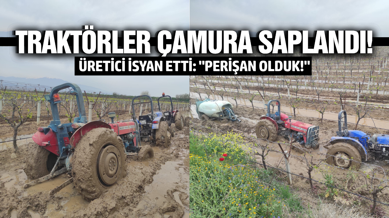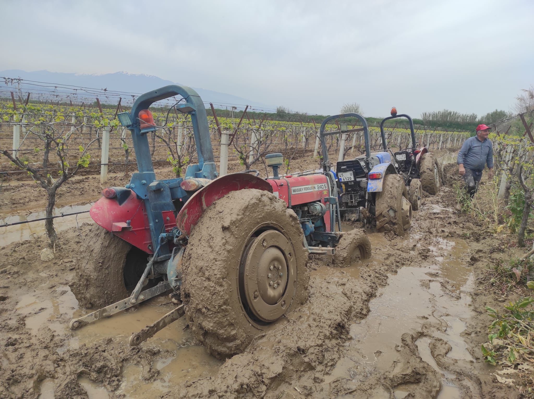 Toygar Mahallesi mevkisindeki bağında ilaçlama mesaisi yapmak isteyen üretici İbrahim Güven, traktörüyle çamura saplanarak mahsur kaldı.