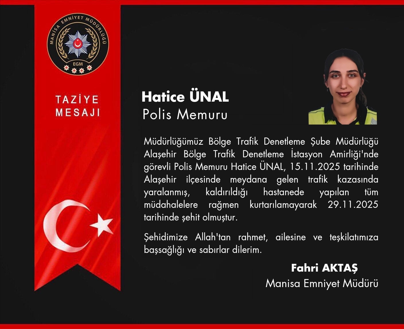 Manisa İl Emniyet Müdürlüğü; Müdürlüğümüz Bölge Trafik Denetleme Şube Müdürlüğü Alaşehir Bölge Trafik Denetleme İstasyon Amirliği'nde görevli Polis Memuru Hatice ÜNAL, 15.11.2025 tarihinde Alaşehir ilçesinde meydana gelen trafik kazasında yaralanmış, kaldırıldığı hastanede yapılan tüm müdahalelere rağmen kurtarılamayarak 29.11.2025 tarihinde şehit olmuştur.