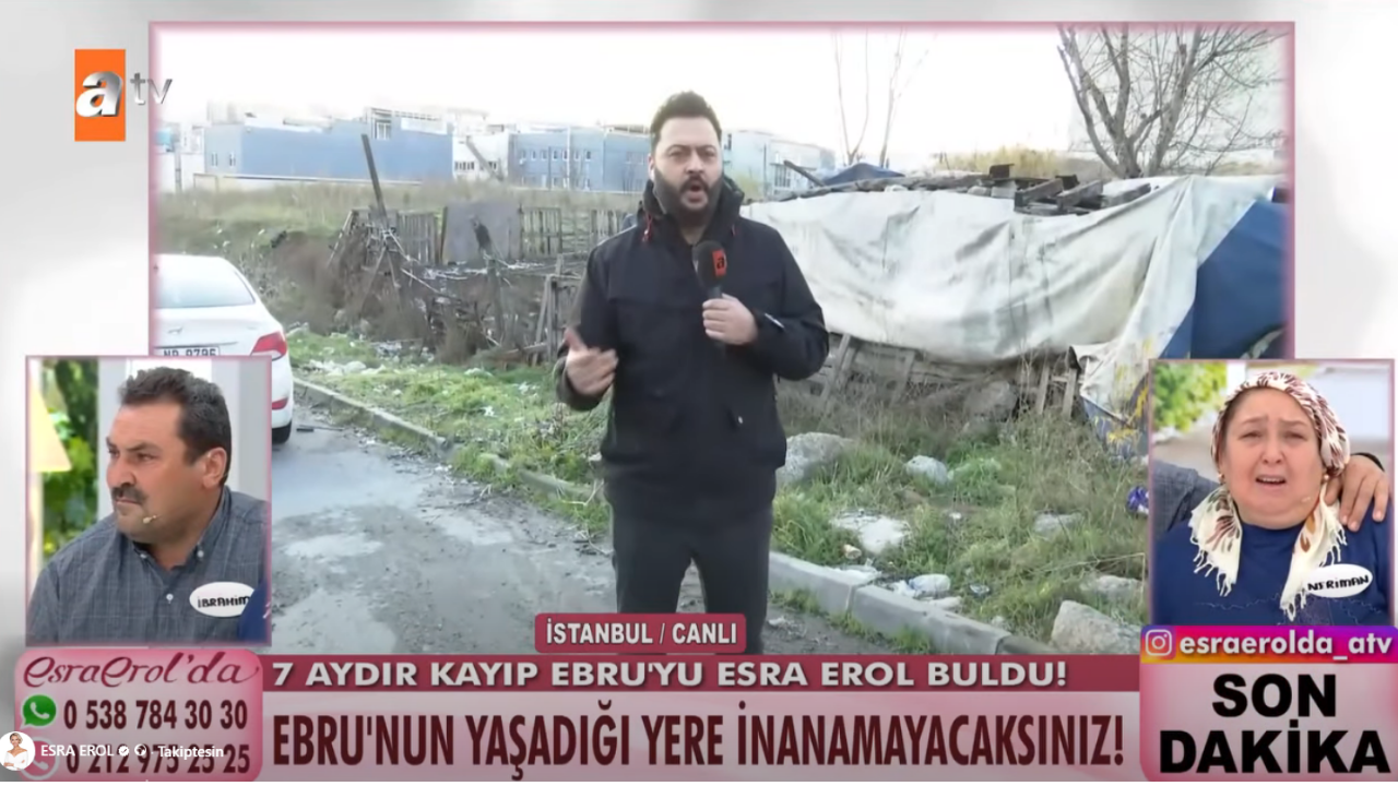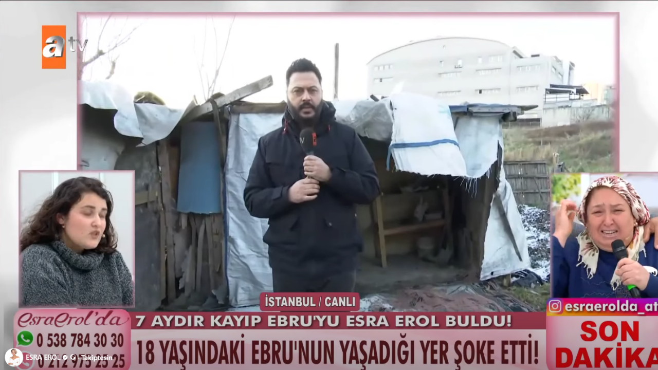 Gelen onlarca ihbar Ebru Karataş’ın izini İstanbul Esenyurt’ta bulundu. Şehrin merkezinde olmasına rağmen, sıcak suyun ve banyonun olmadığı, suyun dışarıdan taşındığı ve çevresinde kümeslerin bulunduğu yarı çadır yarı baraka bir yapıya ulaşıldı.