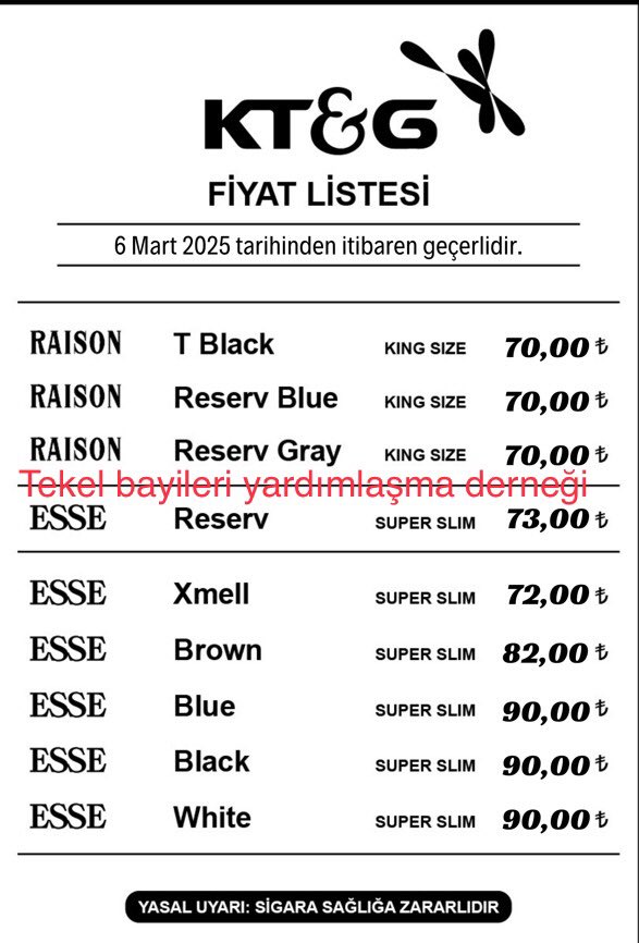 Tekel Bayileri Yardımlaşma Derneği (TBYD) tarafından paylaşılan yeni fiyat listesine göre, KT&G markasına ait sigaraların fiyatları 6 Mart 2025 tarihinden itibaren geçerli olmak üzere güncellendi.