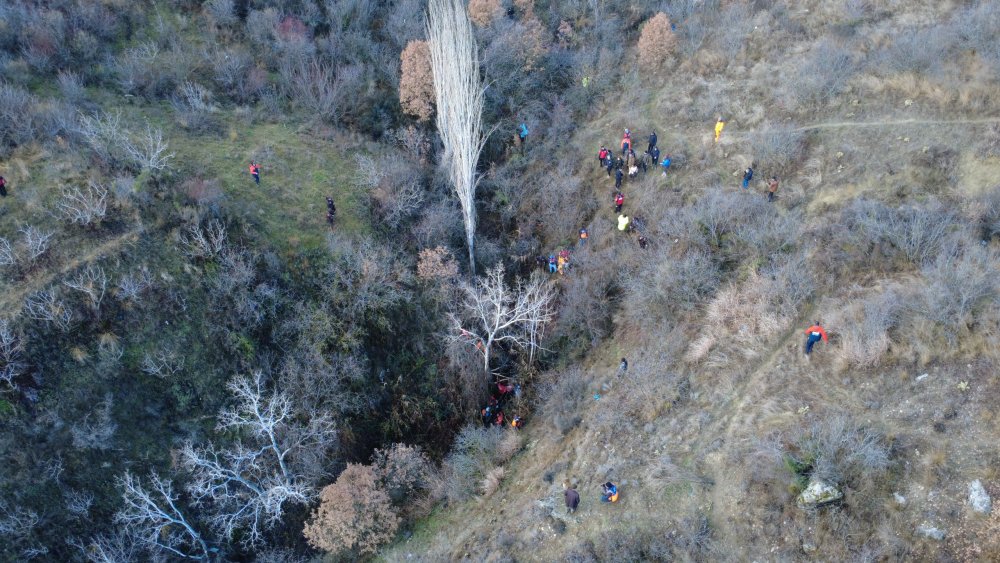 Kadavra ve iz takip köpeklerinin de destek verdiği çalışmalarda, dronlar aracılığıyla engebeli arazi, dere yatakları ve ormanlık alanlar tarandı.