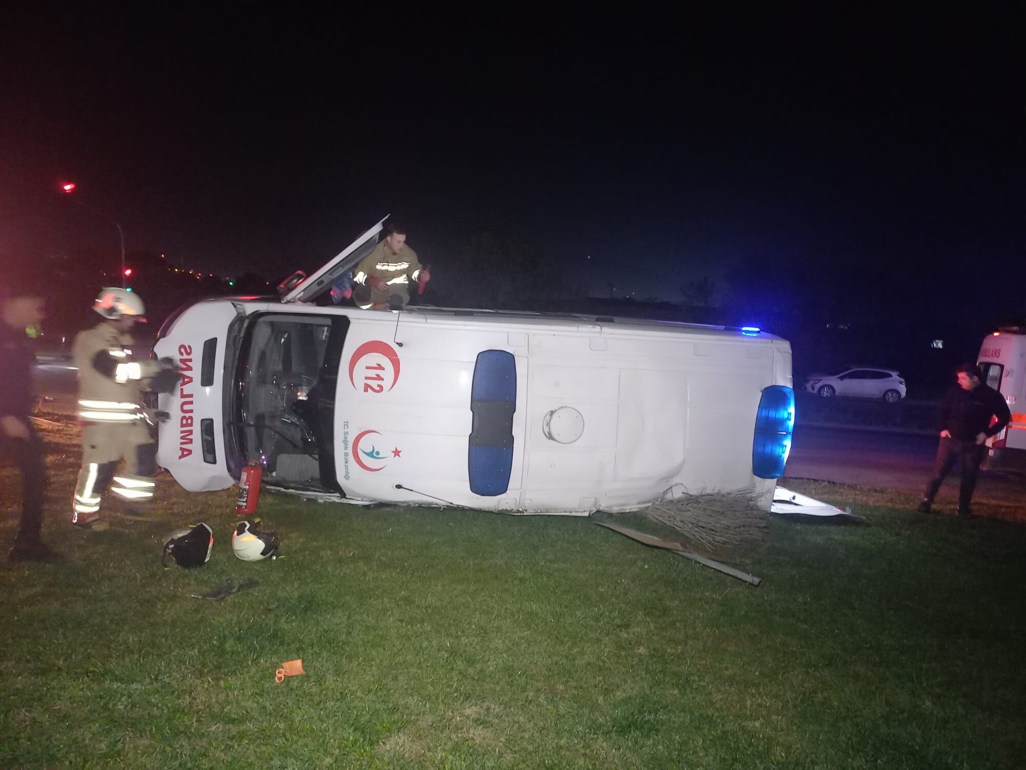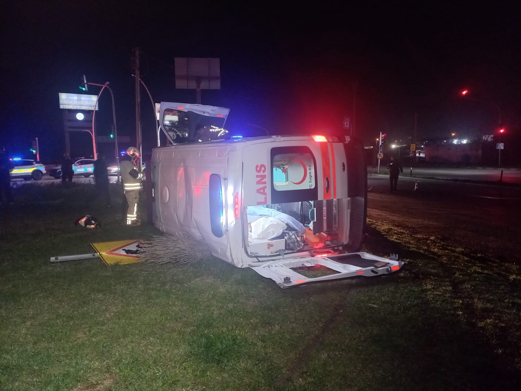 Çarpışmanın şiddetiyle otomobil yola savrulurken, ambulans devrildi.
