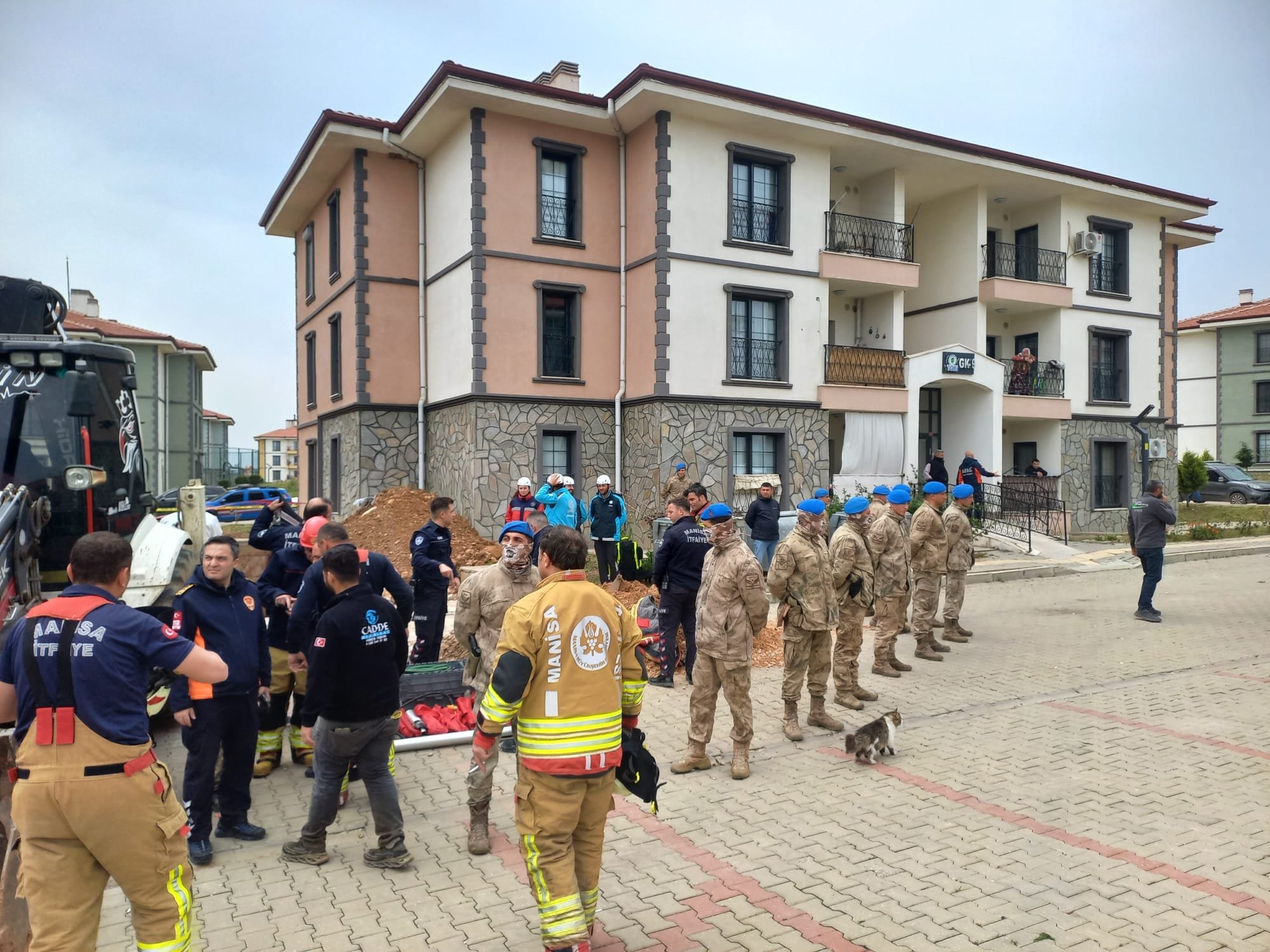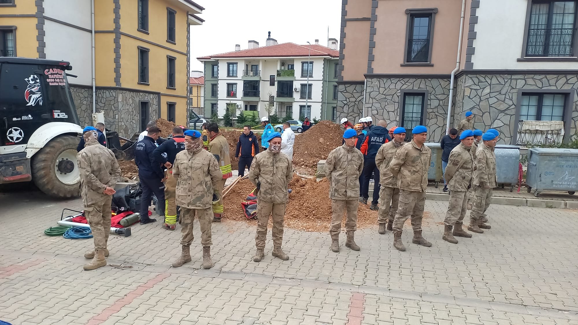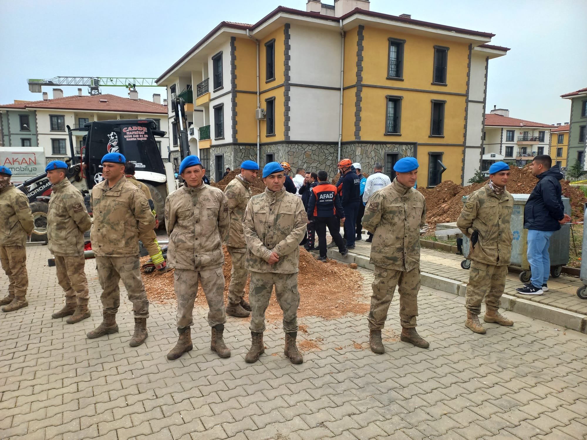 Kurtarma çalışmaları sırasında iş makineleri titizlikle toprağı tahliye ederken, jandarma ekipleri de yeni bir kaza riskine karşı çevrede geniş güvenlik önlemleri alarak alanı kontrol altında tuttu.