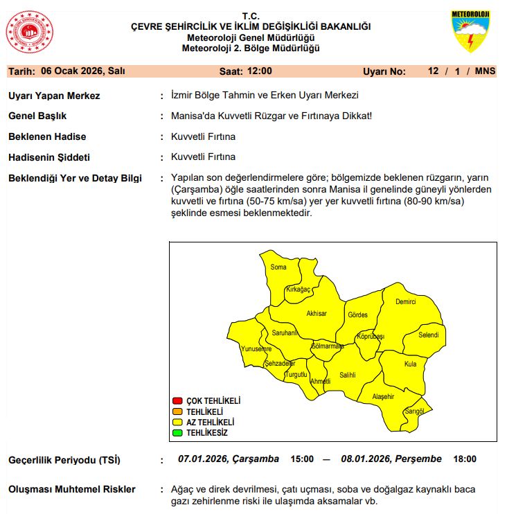 Meteoroloji Genel Müdürlüğü'nden alınan bilgilerine göre, 7 Ocak 2026 itibarıyla Manisa ve çevresi için yapılan kuvvetli rüzgar ve fırtına uyarısı 8 Ocak saat 18.00'a kadar süreceği tahmin edildi.