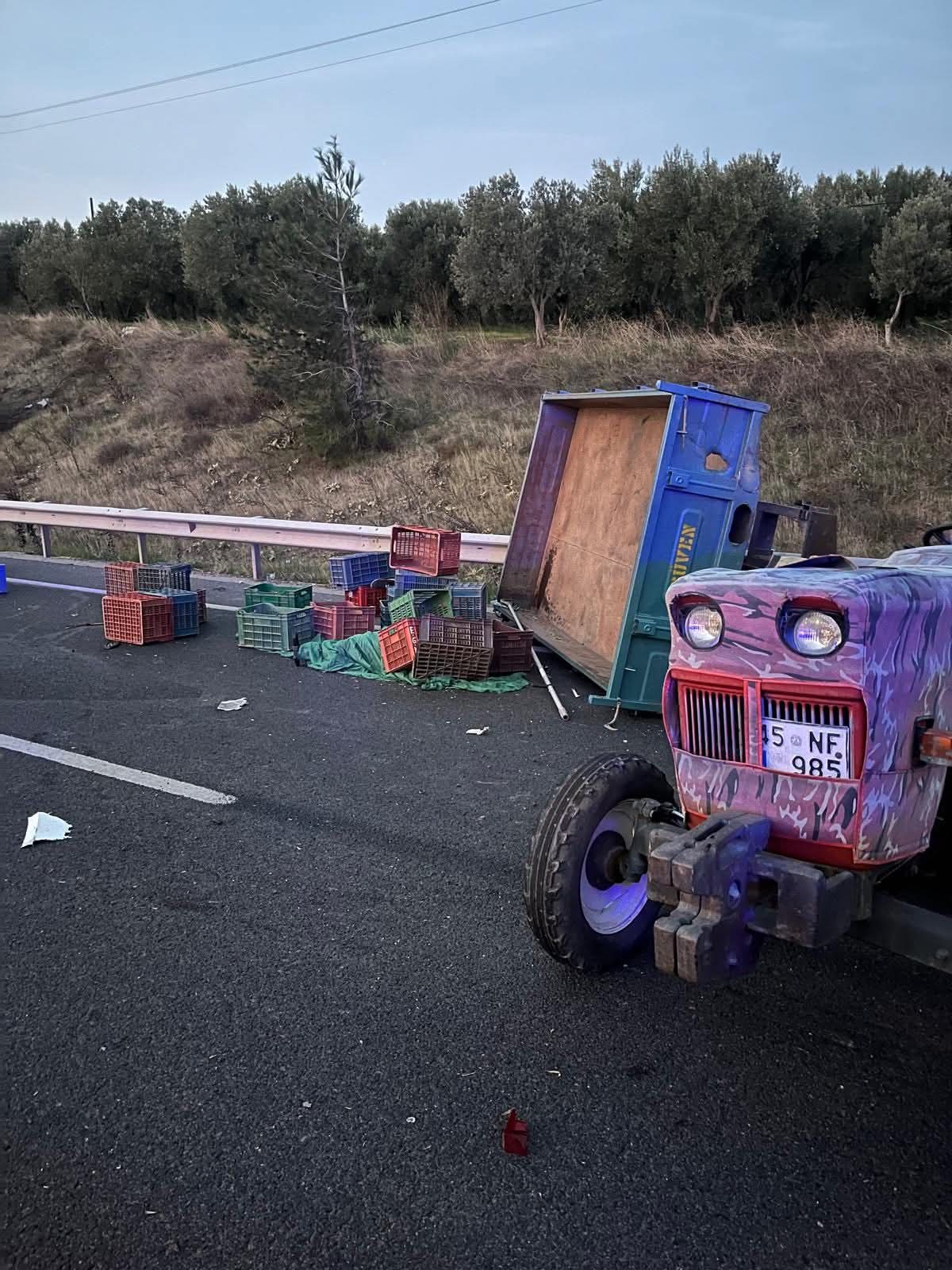 Görgü tanıklarının ifadelerine göre şiddetli çarpışmanın etkisiyle traktörde bulunan zeytin kasalarının bir kısmı yola savruldu.