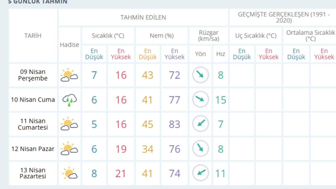 Tahminlere göre, Cuma günü (10 Nisan) beklenen sağanak yağışın sonrasında hava hızla soğuyacak. Cumartesi gününe bağlanan gece, termometrelerin merkezde 5-6°C'ye, yüksek ve iç kesimlerde ise 0°C ve altına inmesi öngörülüyor.