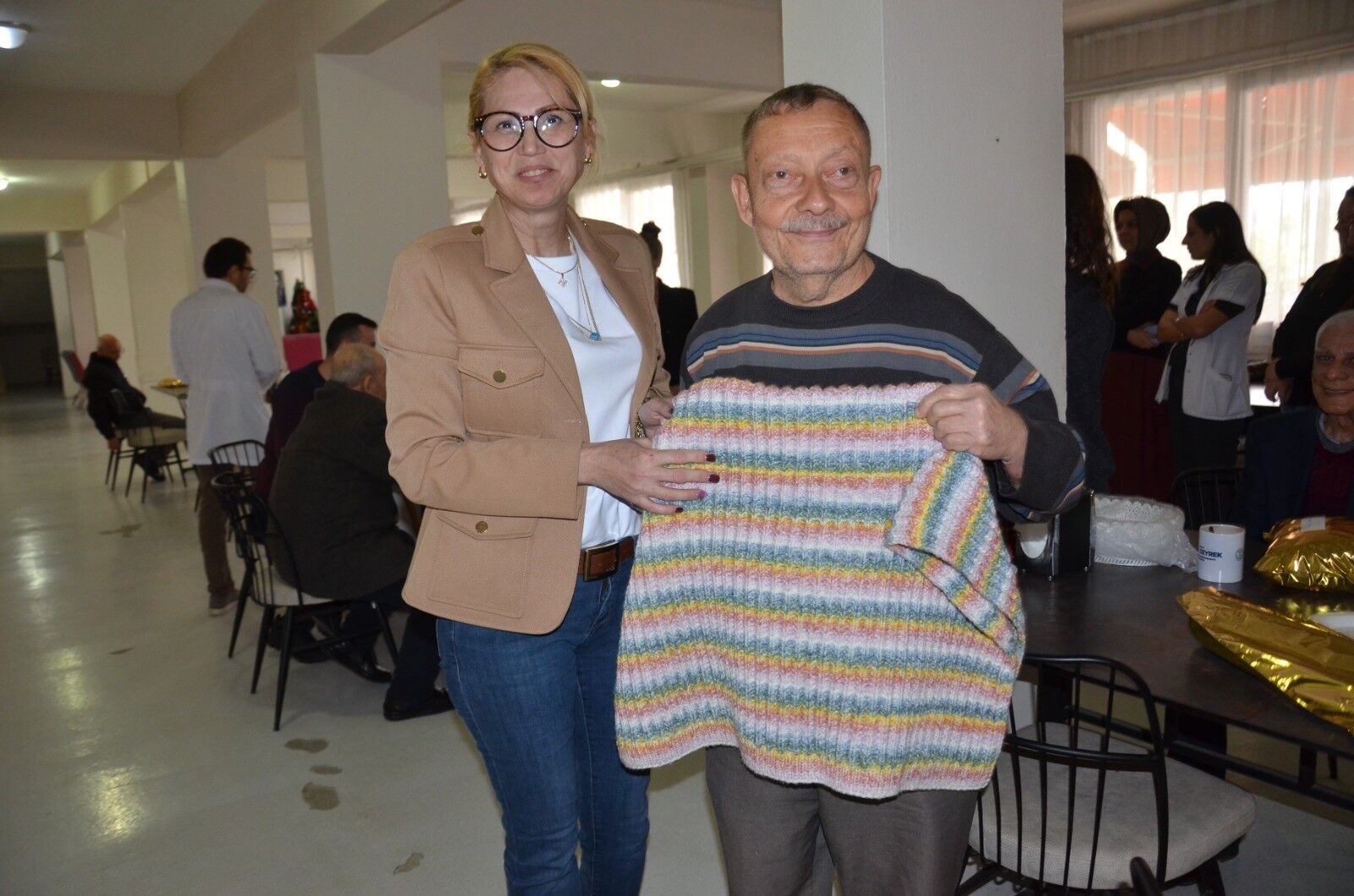 Yaşlılar Haftası kapsamında Manisa Huzurevi'nde kalan yaşlılara, Doktorların el emeğiyle ördüğü kazak, yelek, atkı ve şallar, hediye edildi.