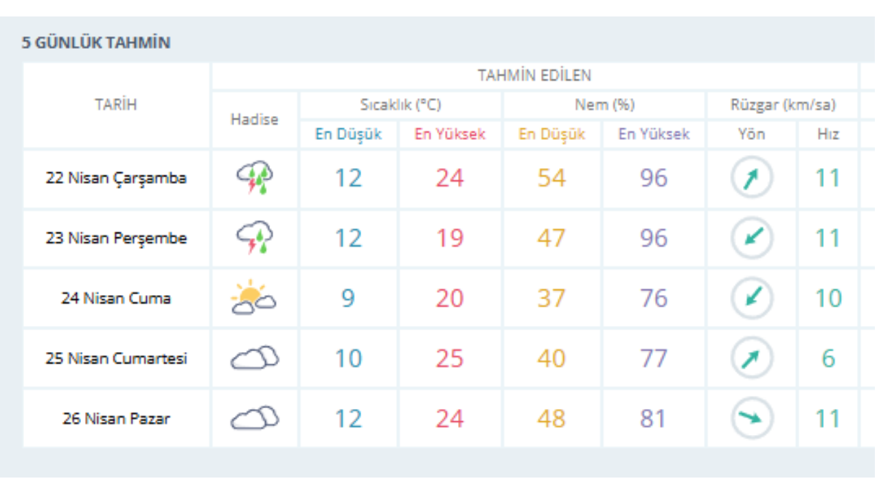 22 Nisan Çarşamba günü gök gürültülü sağanak yağışlı bir hava beklenmekte olup sıcaklıklar 12 ile 24 derece, nem oranı ise yüzde 54 ile 96 aralığında seyretmesi öngörülüyor.