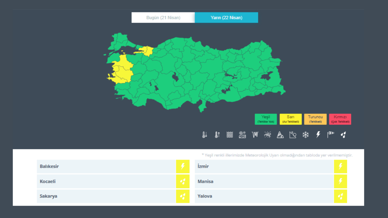 Meteoroloji Genel Müdürlüğü (MGM), Manisa il geneli için 22 Nisan Çarşamba günü etkili olması beklenen gök gürültülü sağanak yağış nedeniyle "sarı kodlu" uyarı yayınladı.