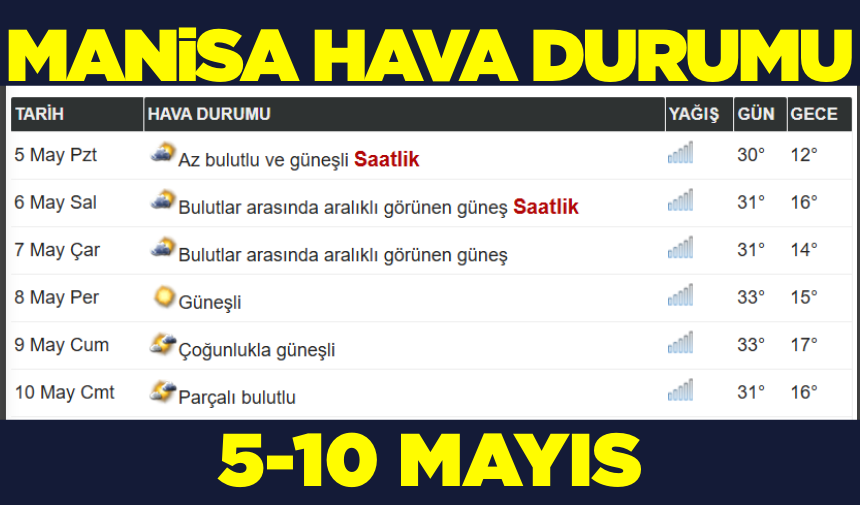 Son olarak 5 ile 10 Mayıs arası Manisa'da hava nasıl olacak buna bir göz atalım...