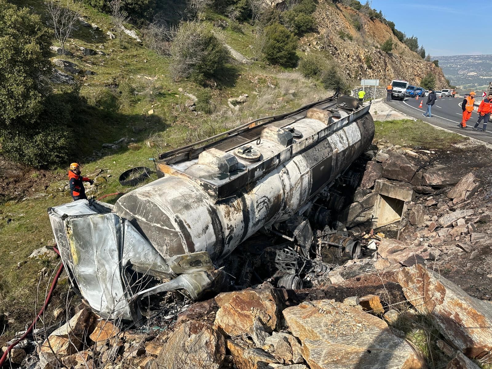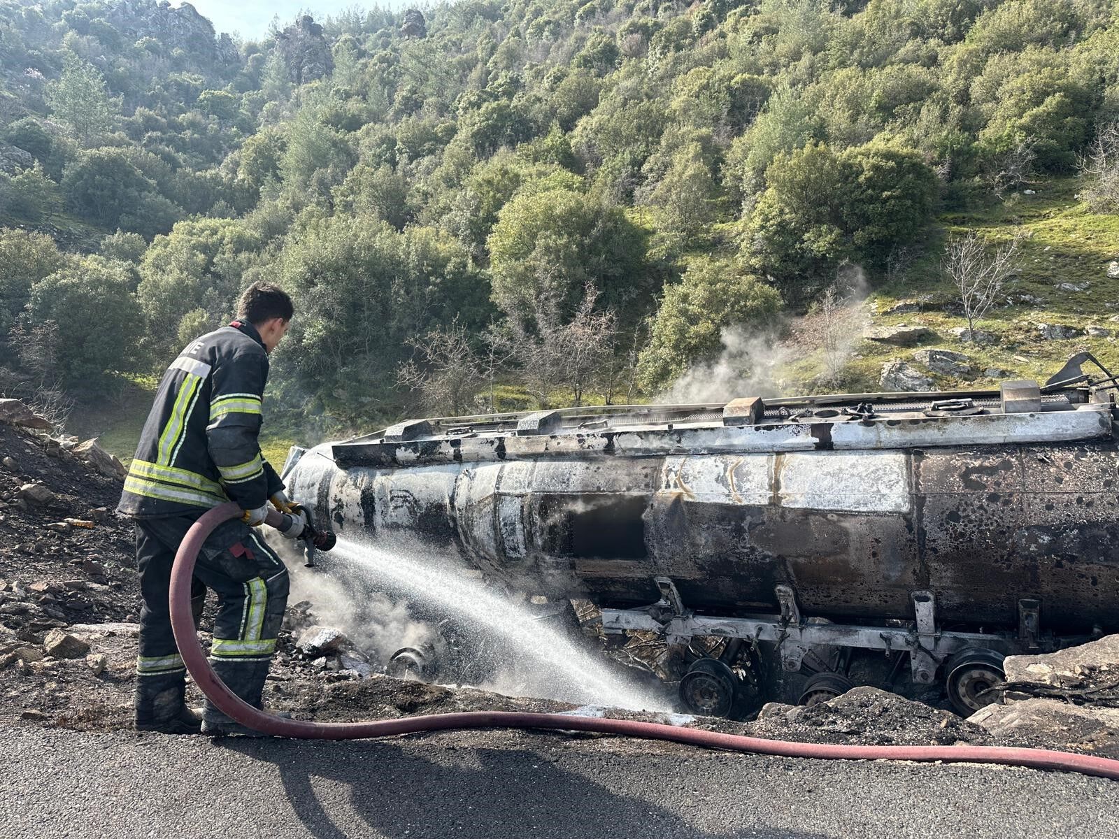 Kaza sonrası tankerde henüz belirlenemeyen bir nedenle yangın çıktı. Kısa sürede büyüyen alevler tüm aracı kapladı.