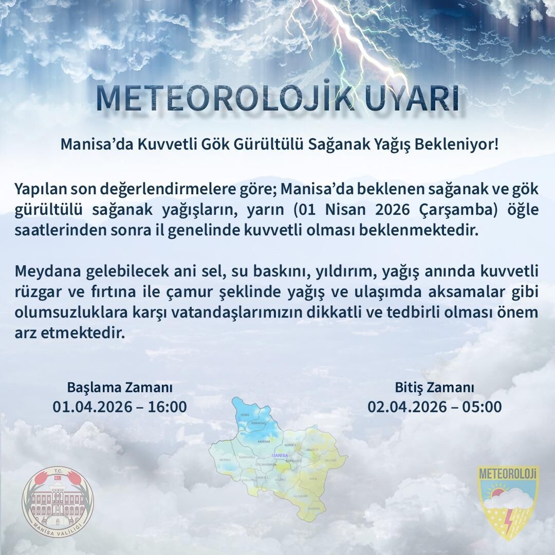 Meteoroloji Genel Müdürlüğü ve Manisa Valiliği, bugün öğle saatlerinden itibaren il genelinde etkili olması beklenen kuvvetli gök gürültülü sağanak yağışlara karşı "sarı kodlu" uyarıda bulundu.