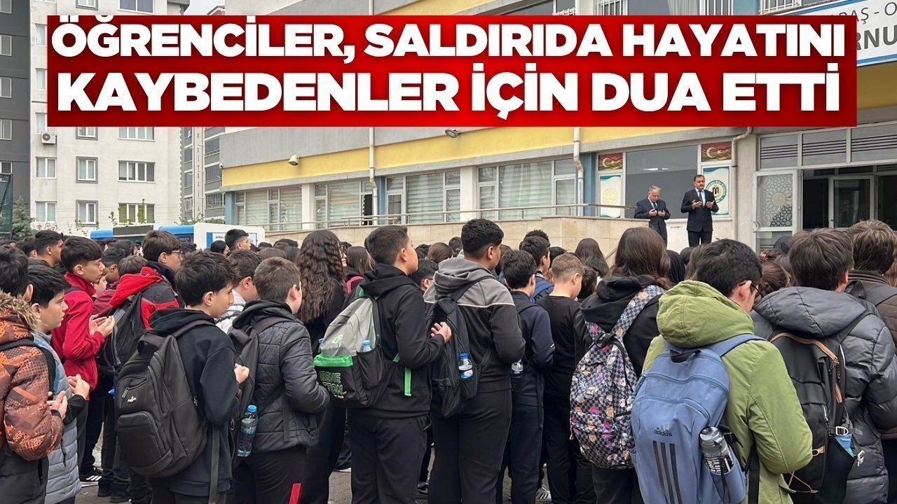 Öğrenciler saldırıda hayatını kaybeden öğretmen ve öğrenciler anısına ellerini semaya açıp dua etti.