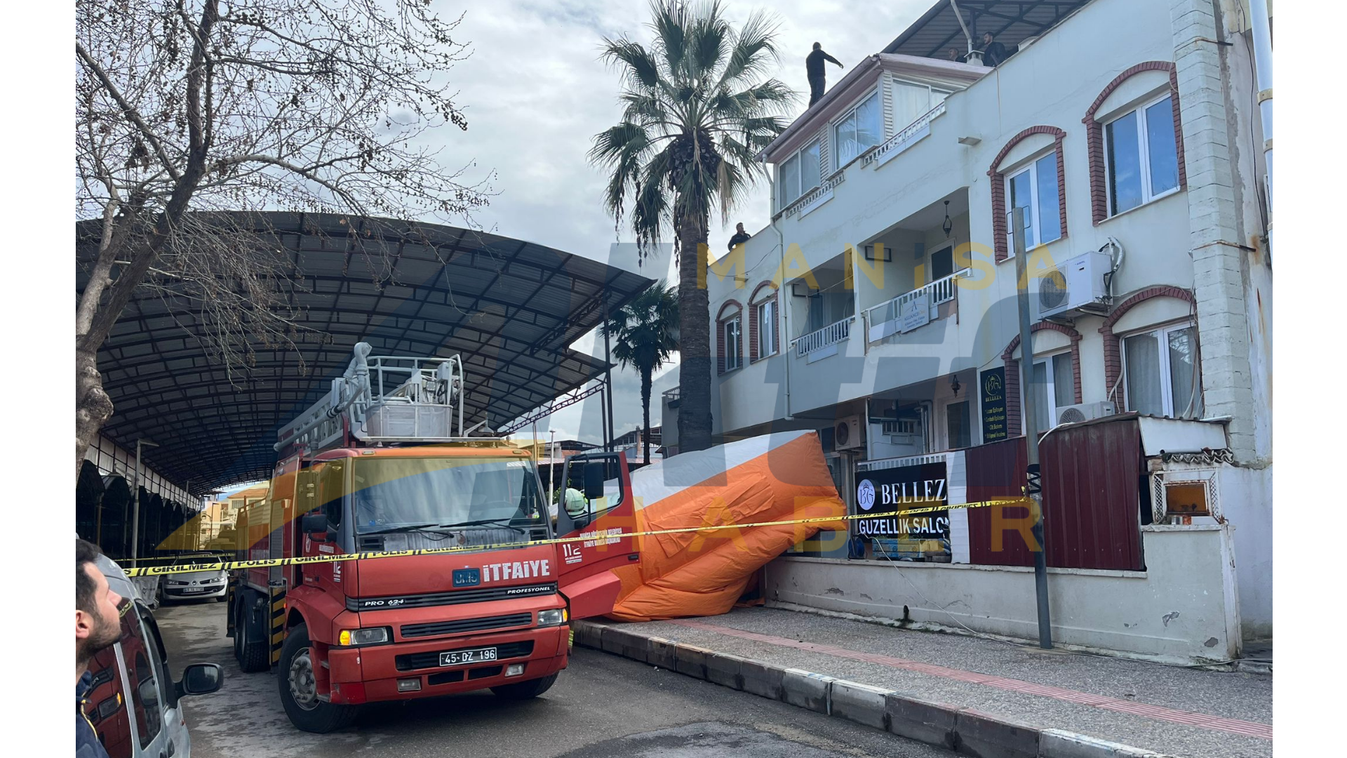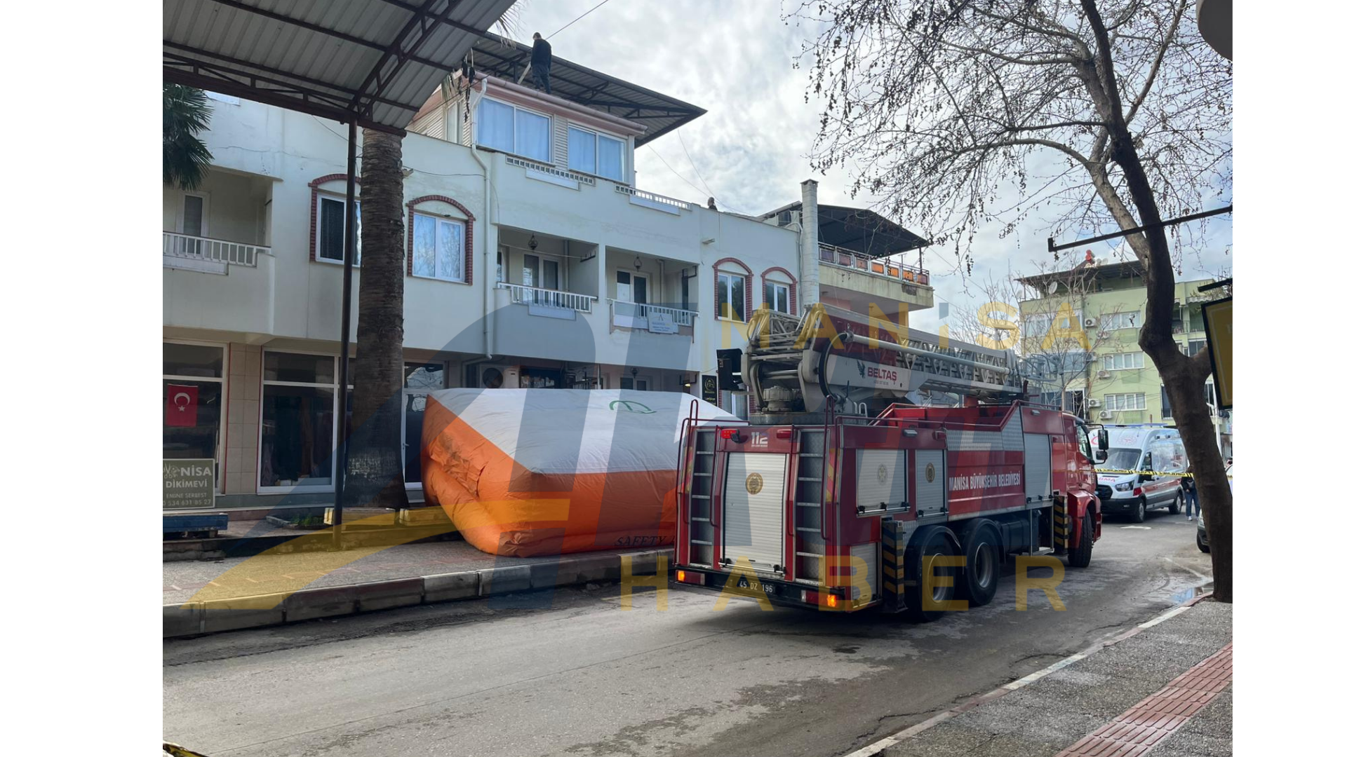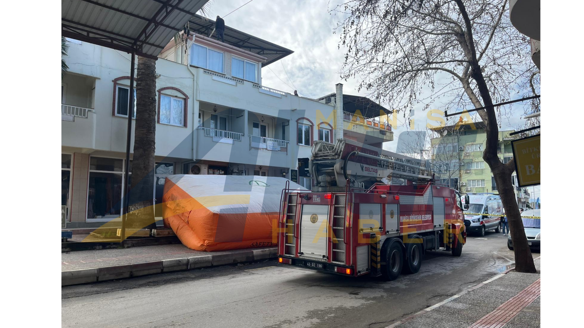 İtfaiye ekipleri, şahsın atlama ihtimaline karşı binanın altına şişme kurtarma yastığı açarak güvenlik önlemi aldı.