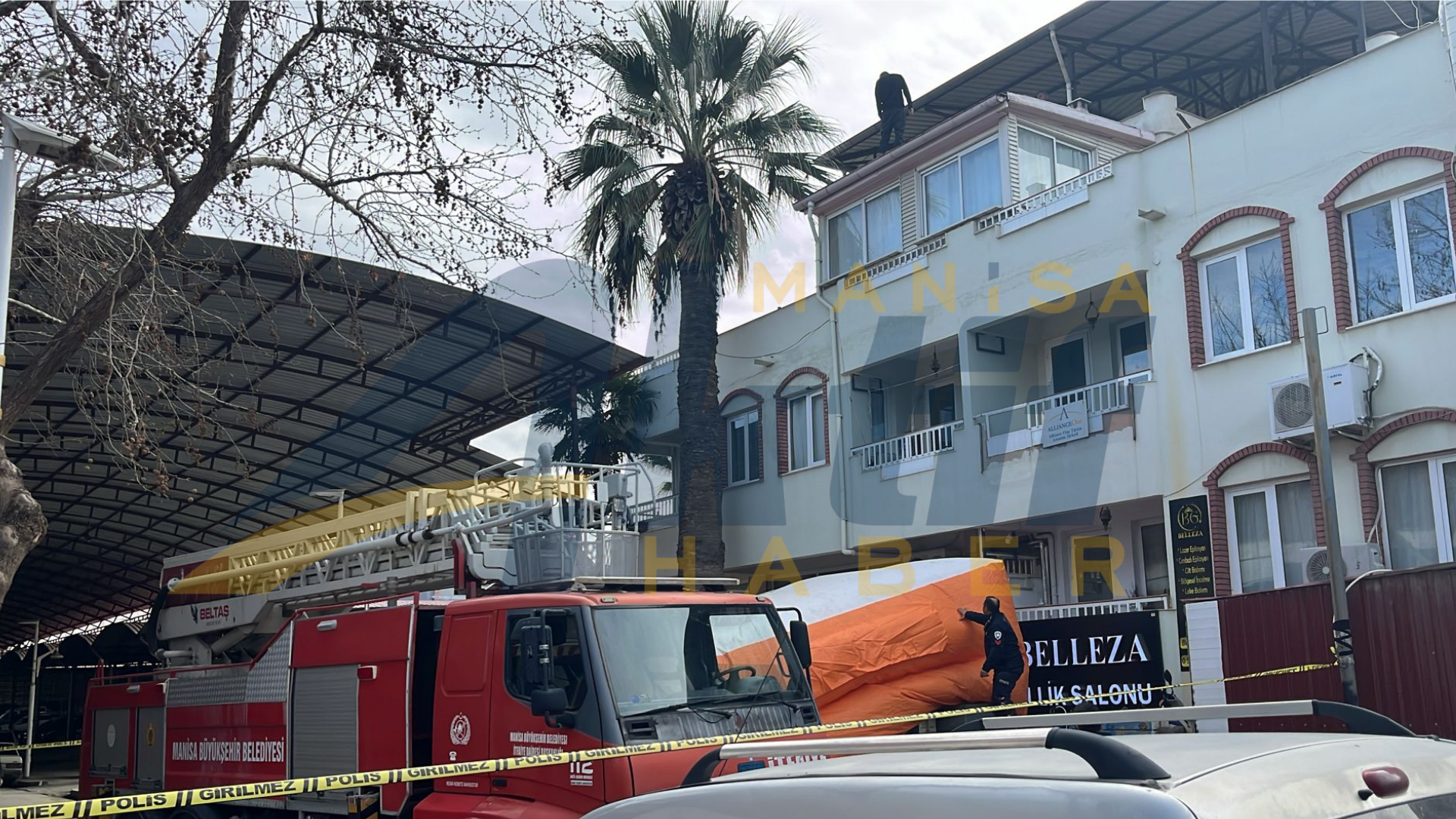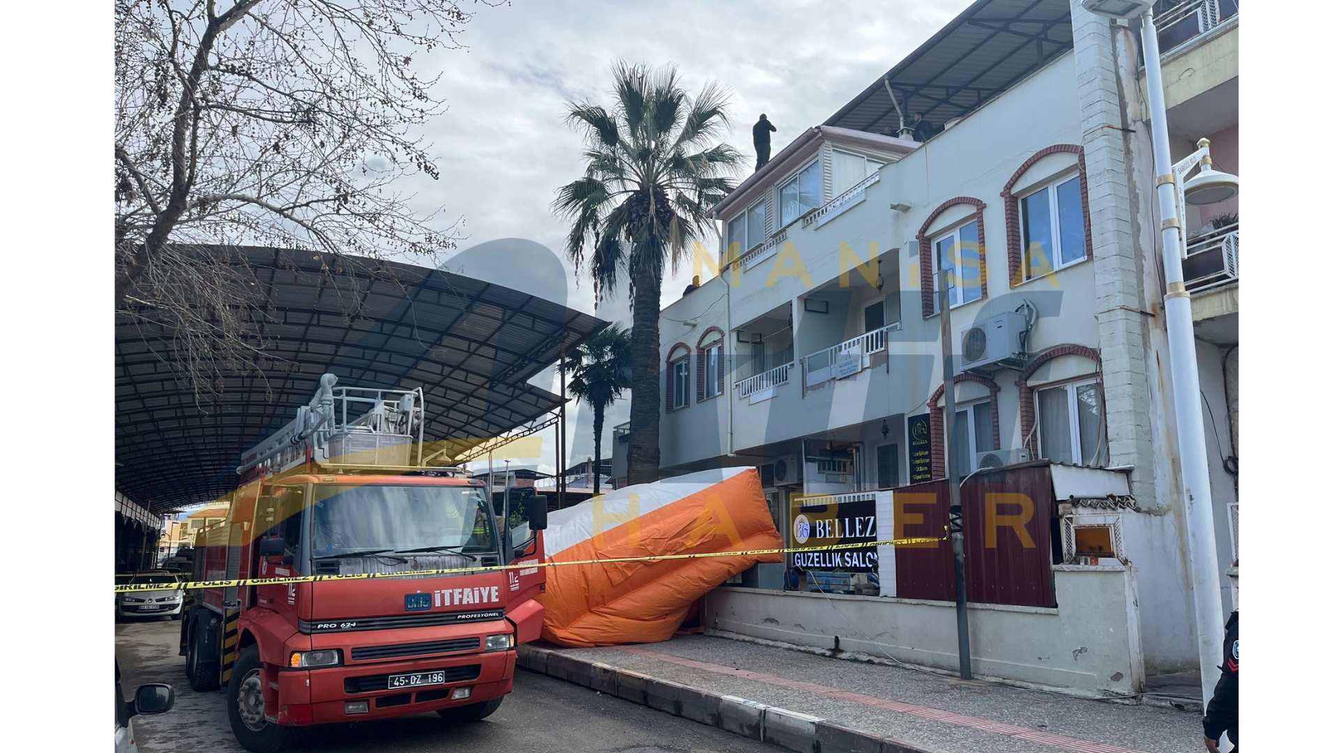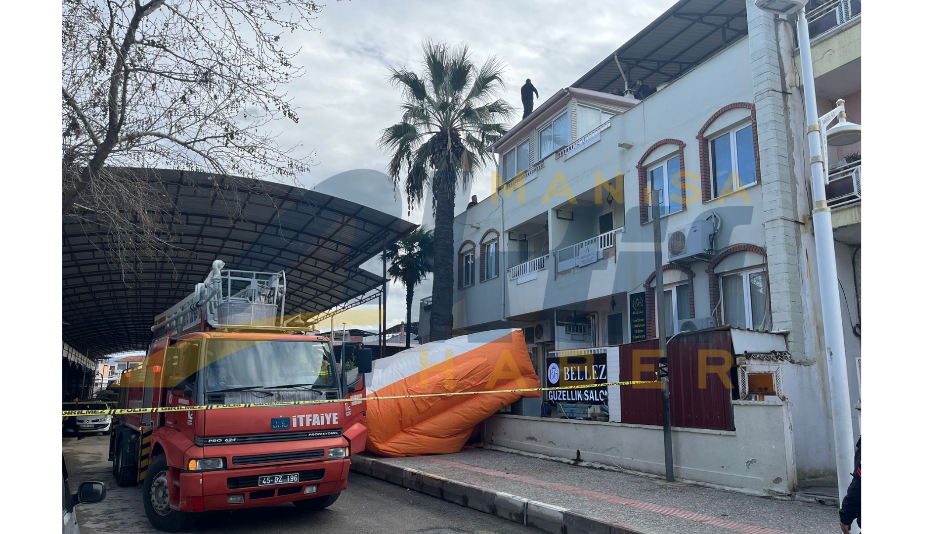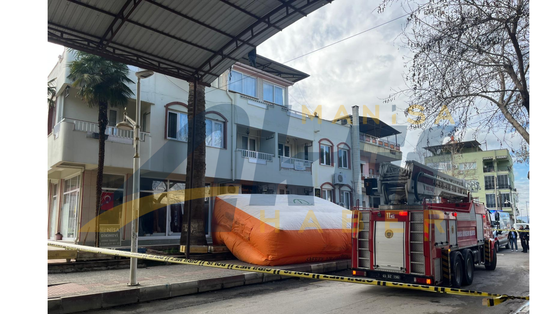İtfaiye ekipleri, şahsın atlama ihtimaline karşı binanın altına şişme kurtarma yastığı açarak güvenlik önlemi aldı.