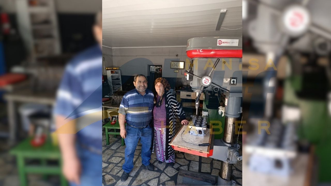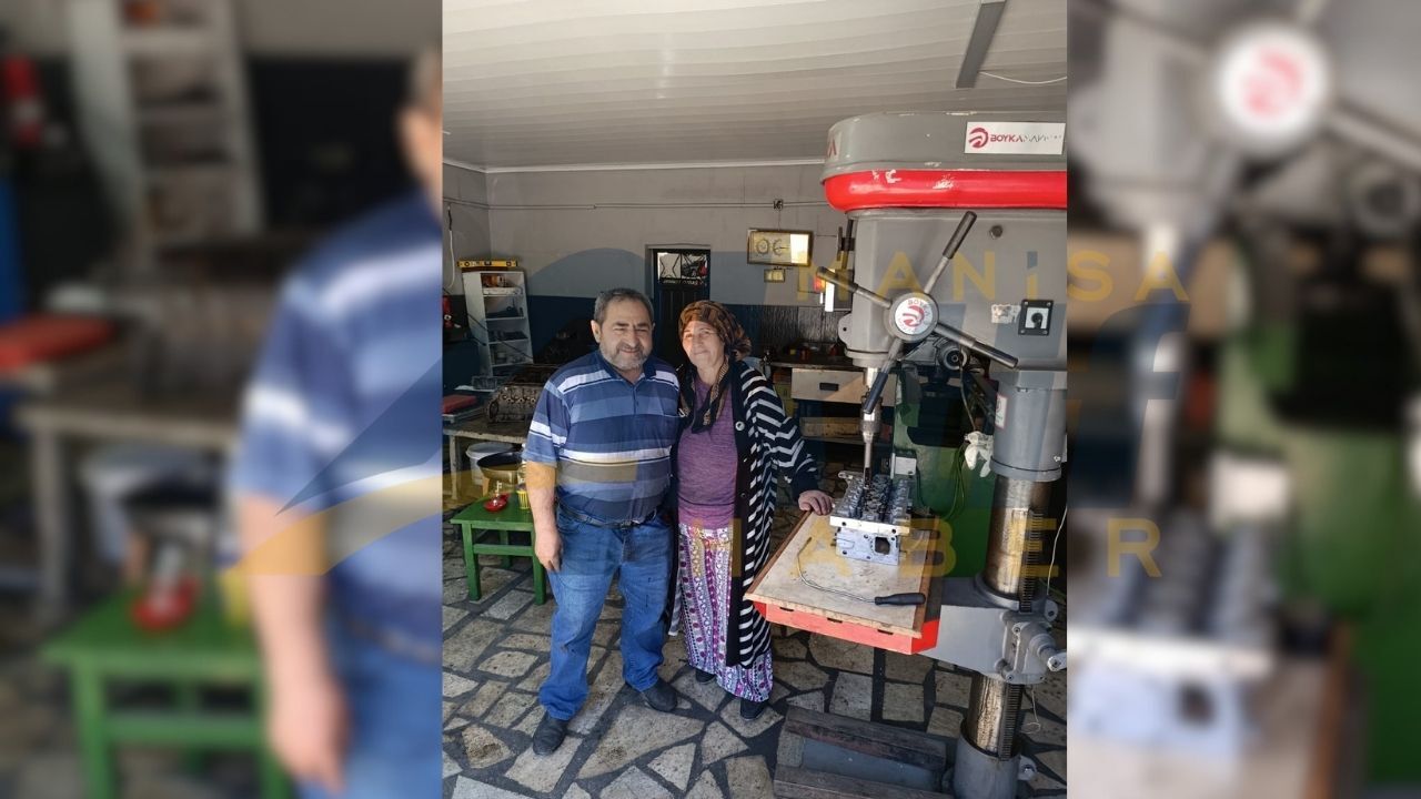 İbrahim ve Neriman Çevik, atölyelerinin önünde poz verdi. Yeni açılan atölye, Sarıgöl esnafının tamirat ihtiyacına cevap verecek.