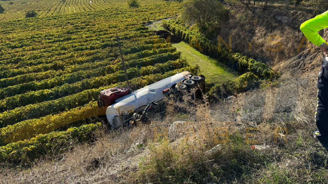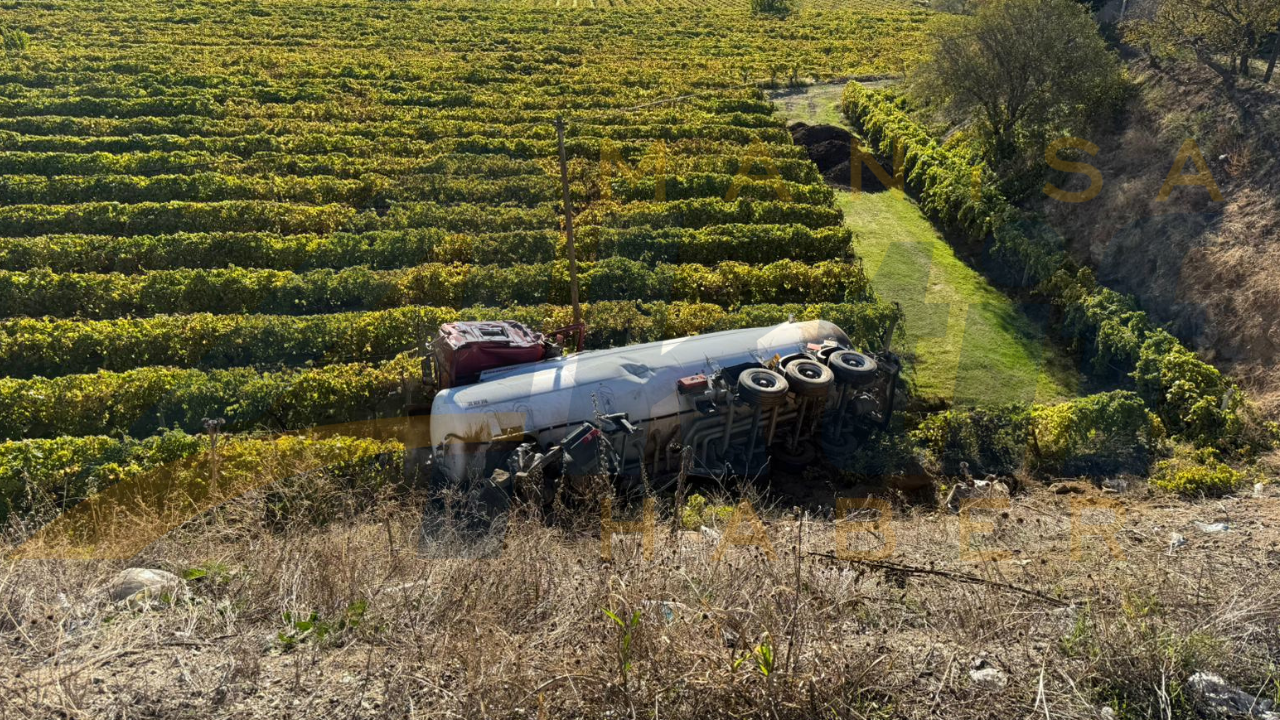 Yoldan çıkan yakıt tankeri üzüm bağına devrildi.