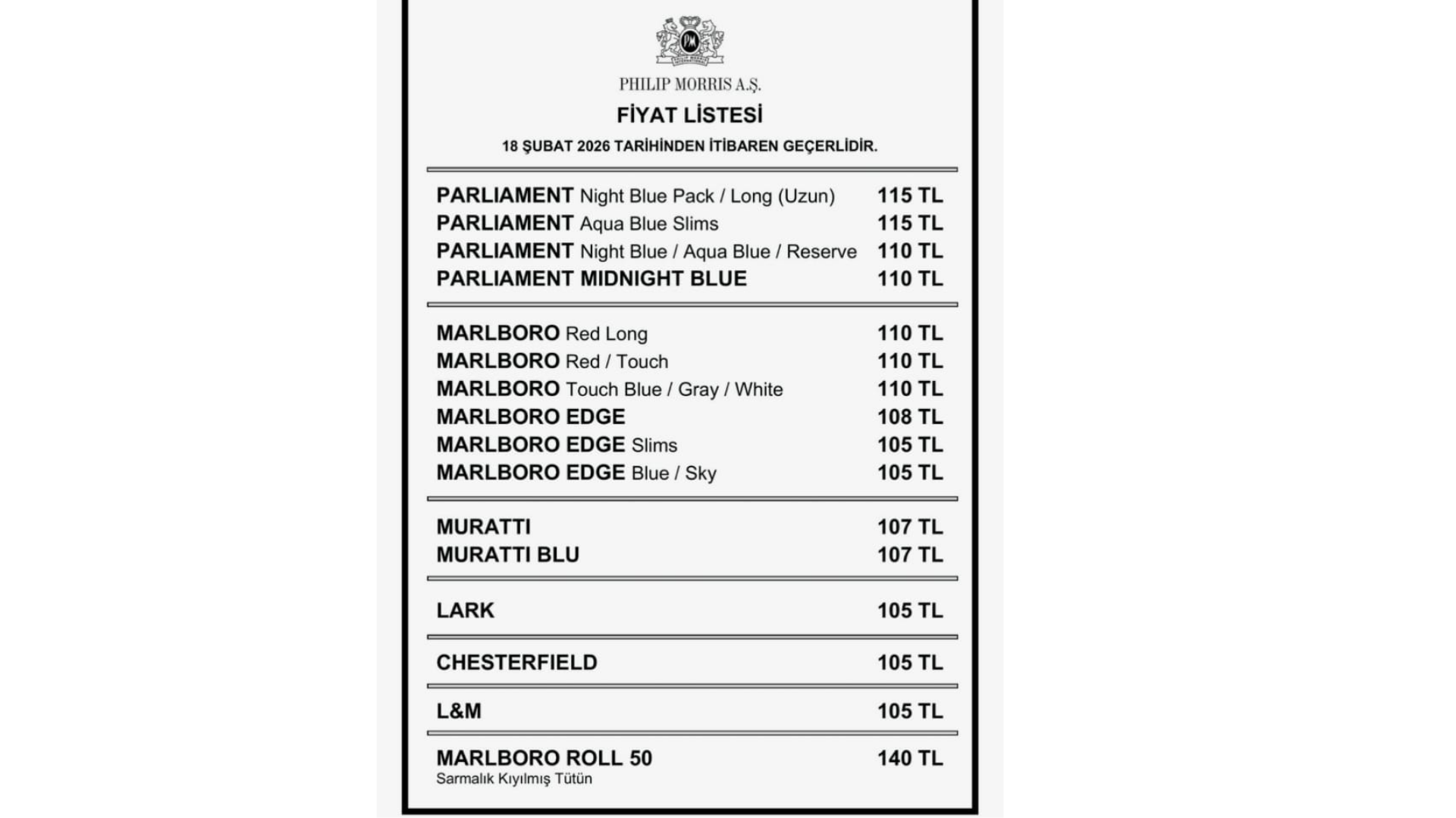 Marlboro Red ve Touch serisi 110 TL’den satışa sunulurken, Marlboro Edge 108 TL, Muratti ve Muratti Blu ise 107 TL olarak belirlendi.