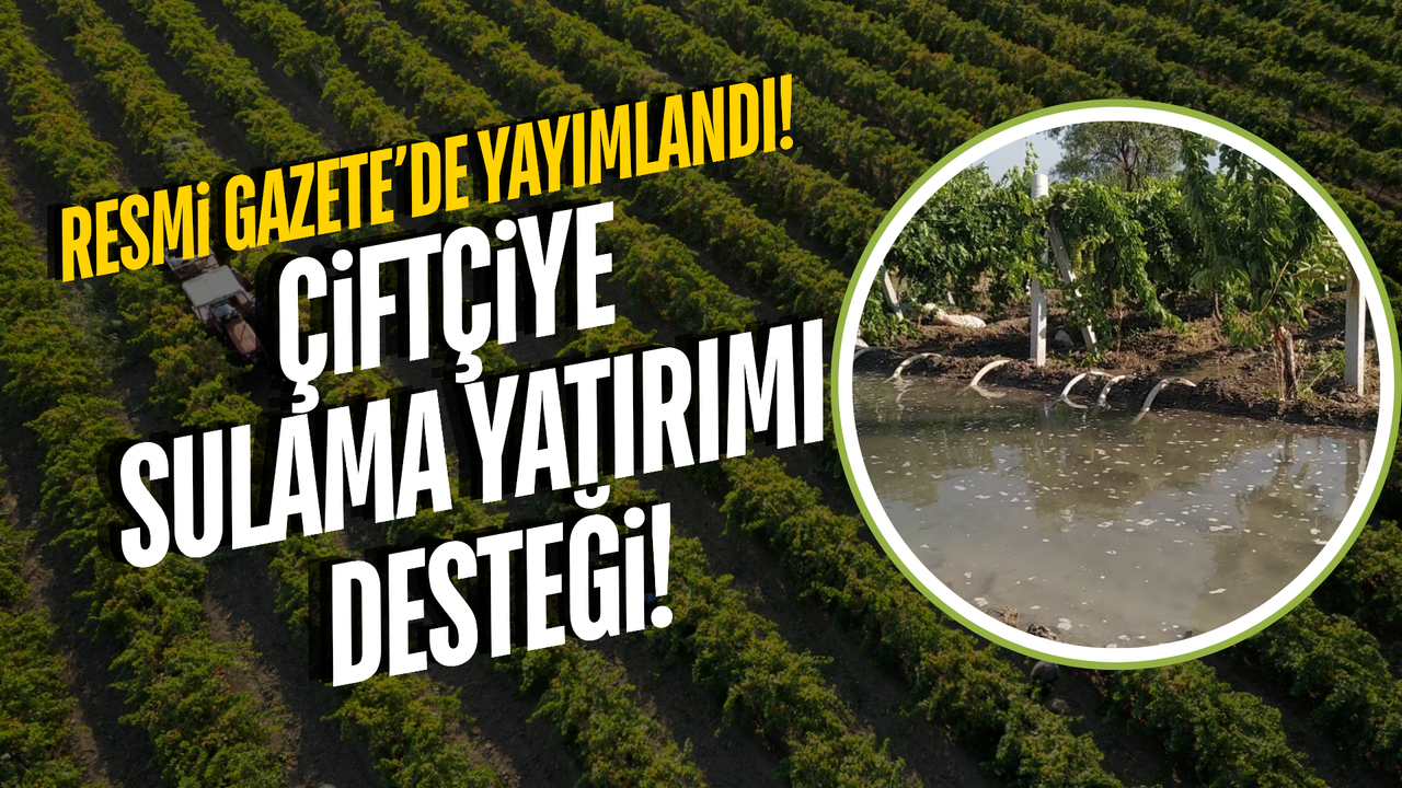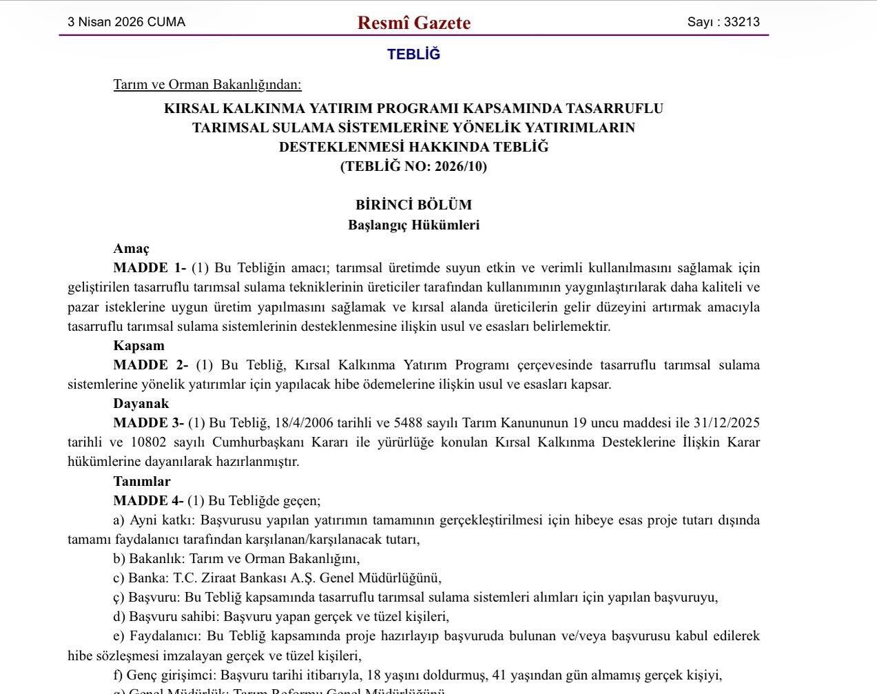 Tarım ve Orman Bakanlığınca hazırlanan "Kırsal Kalkınma Yatırımları Kapsamında Tasarruflu Tarımsal Sulama Sistemlerine Yönelik Yatırımların Desteklenmesi Hakkında Tebliğ", Resmi Gazete'de yayımlanarak yürürlüğe girdi.
