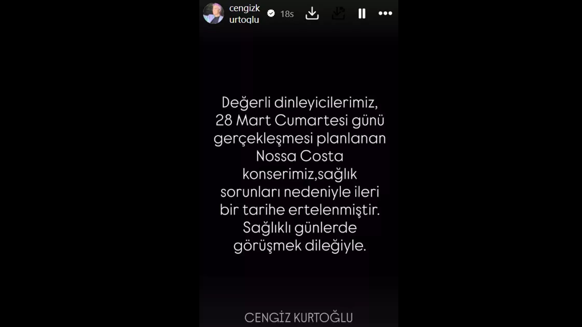Sanatçı paylaşımında, "Değerli dinleyicilerimiz, 28 Mart Cumartesi günü gerçekleşmesi planlanan konserimiz sağlık sorunları nedeniyle ileri bir tarihe ertelenmiştir." ifadelerini kullandı.