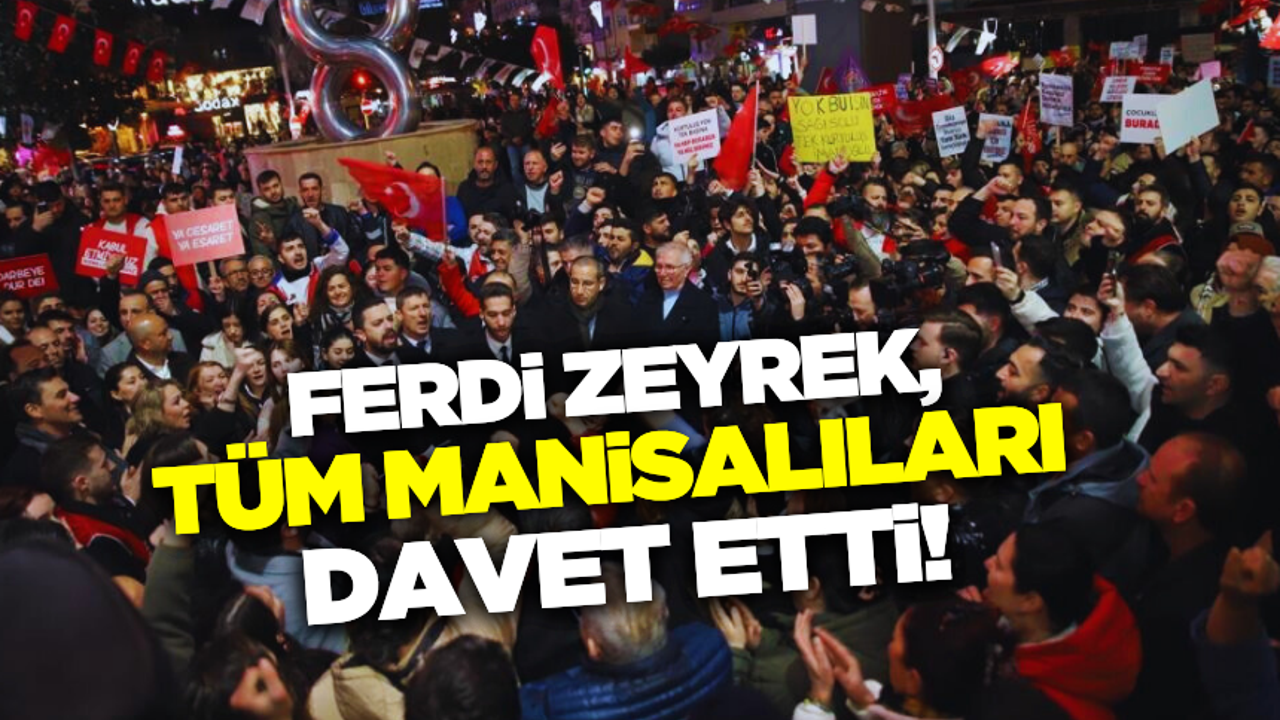 Manisa Büyükşehir Belediye Başkanı Ferdi Zeyrek, Manisalıları Manolya Meydanı'nda düzenlenecek olan "19 Mart Darbesine Teslim Olmayız" mitingine davet etti. Başkan Zeyrek, "19 Mart Darbesine teslim olmayanlarız, bugün Manolya Meydanı’nda buluşuyoruz! Halkın egemenliğine, sandık iradesine ve Ekrem İmamoğlu’na sahip çıkıyoruz!" ifadelerini kullandı. Buluşma, 20:30'da Manolya Meydanı'nda gerçekleşecek.