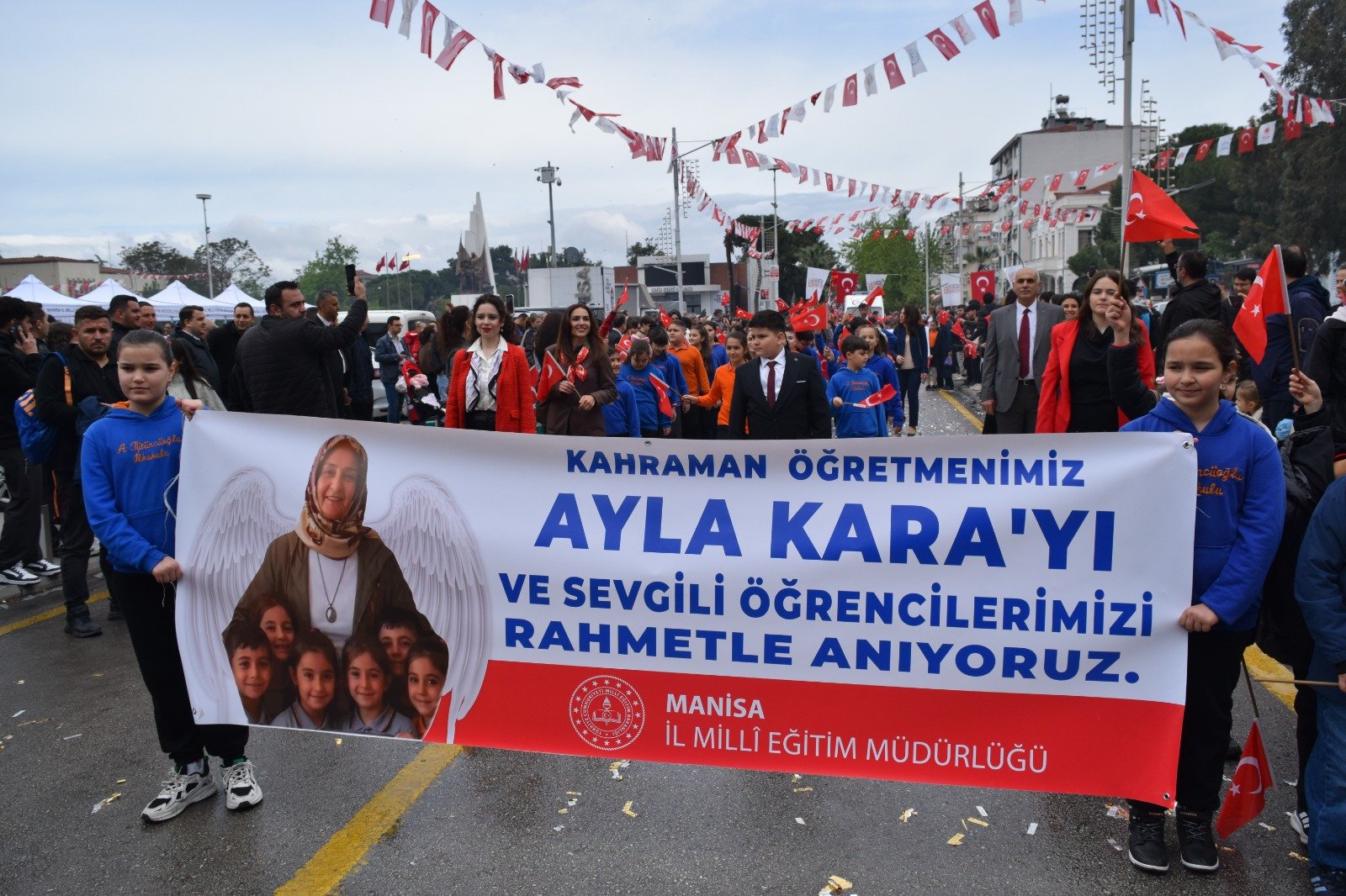 Çocuklara armağan edilen bu anlamlı günde, öğrencilerini korumak pahasına canını feda eden Ayla Kara, Manisalıların duaları ve saygı duruşuyla bir kez daha ölümsüzleşti. Kutlamalar, anma mesajlarının ardından öğrencilerin hazırladığı gösterilerle devam etti.