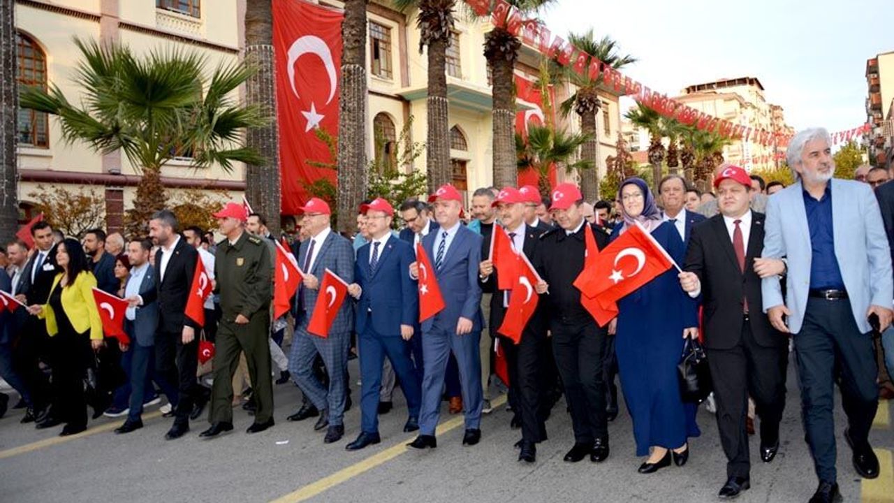 Cumhuriyetin 100. yılı kutlama etkinleri, Cumhuriyet Meydanı ile Tarzan Meydanı güzergahında gerçekleştirilen ‘Kutlama Programları Açılış Yürüyüşü” ile başladı. Yürüyüş öncesi Cumhuriyet Meydanında Çağatay Uluçay Okulu öğretmen, öğrenci ve velileri tarafından 100. yılda 100 Kişiyle Harmandalı oyunu oynandı.