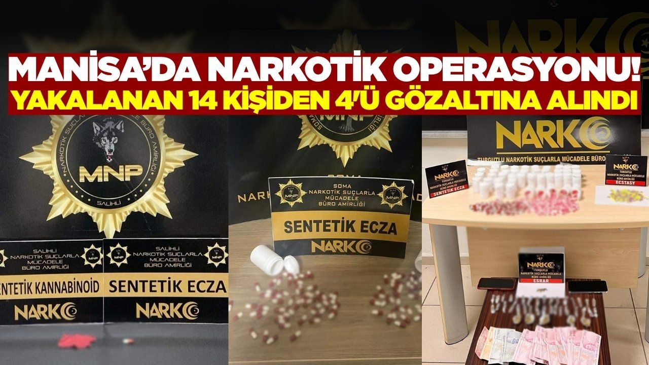 Manisa İl Emniyet Müdürlüğü Narkotik Suçlarla Mücadele Şube Müdürlüğü ile Salihli, Soma ve Turgutlu Büro Amirlikleri ekipleri, "uyuşturucu veya uyarıcı madde imal ve ticaretinin" önlenmesine yönelik sokak çalışmalarını derinleştirdi. Edinilen bilgiye göre, belirlenen adreslere ve şüphelilerin üzerlerine yapılan eş zamanlı operasyonlarda 14 şahıs kıskıvrak yakalandı.