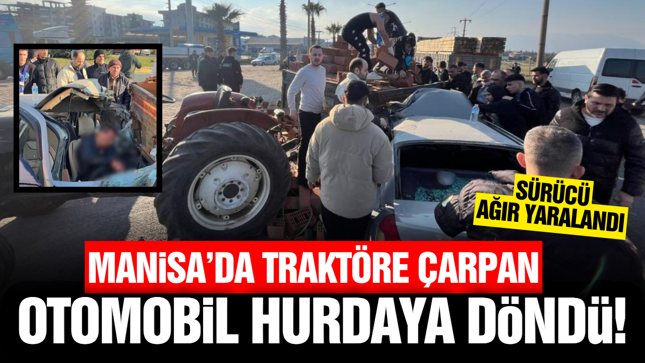 Edinilen bilgiye göre, Turgutlu ilçesinde ters yönde ilerleyerek yolun karşısına geçmeye çalışan kiremit yüklü bir traktör ile bir otomobil çarpıştı. Çarpışmanın şiddetiyle her iki araçta da ağır maddi hasar oluşurken, otomobil sürücüsü ezilen araç içerisinde sıkıştı.
