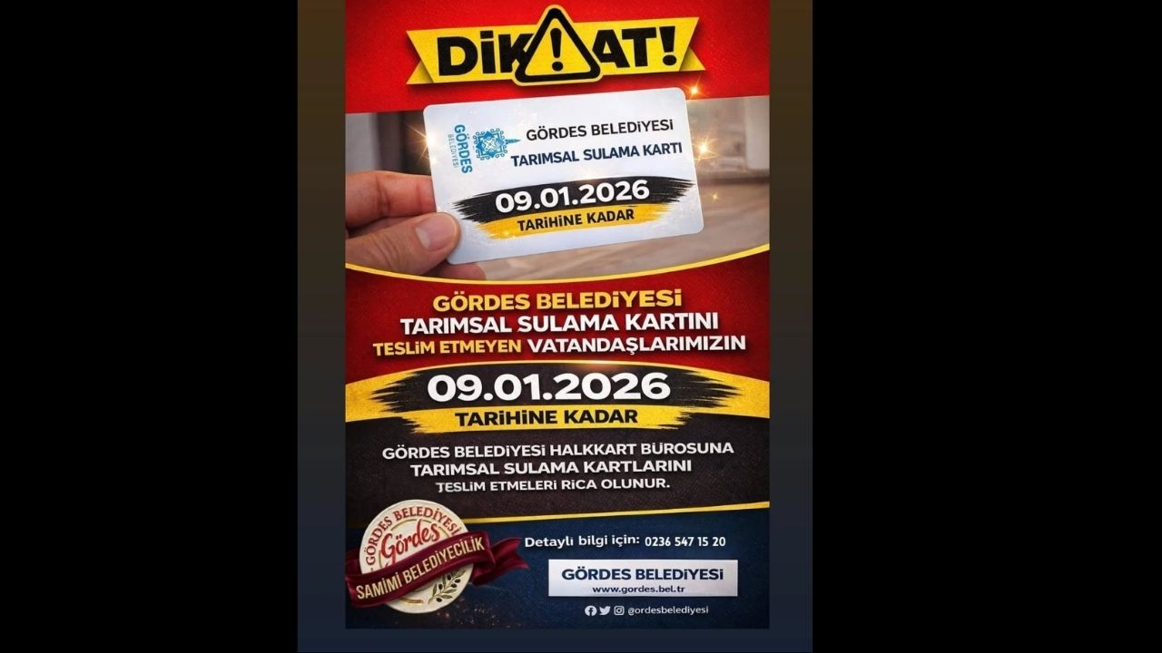 Öte yandan Gördes Belediyesi tarafından, " Gördes Belediyesi tarafından verilen Tarımsal Sulama Kartlarını henüz teslim etmeyen vatandaşlarımızın, En geç 09.01.2026 Cuma gününe kadar kartlarını teslim etmeleri gerekmektedir. Tarımsal Sulama Kartları sadece Gördes Belediyesi Halk Kart Bürosu’ndan teslim alınacaktır. Bunun dışında başka bir noktadan teslim işlemi yapılmayacaktır. Vatandaşlarımızın herhangi bir mağduriyet yaşamamaları adına, belirtilen tarihe kadar işlemlerini tamamlamaları önemle rica olunur." dendi