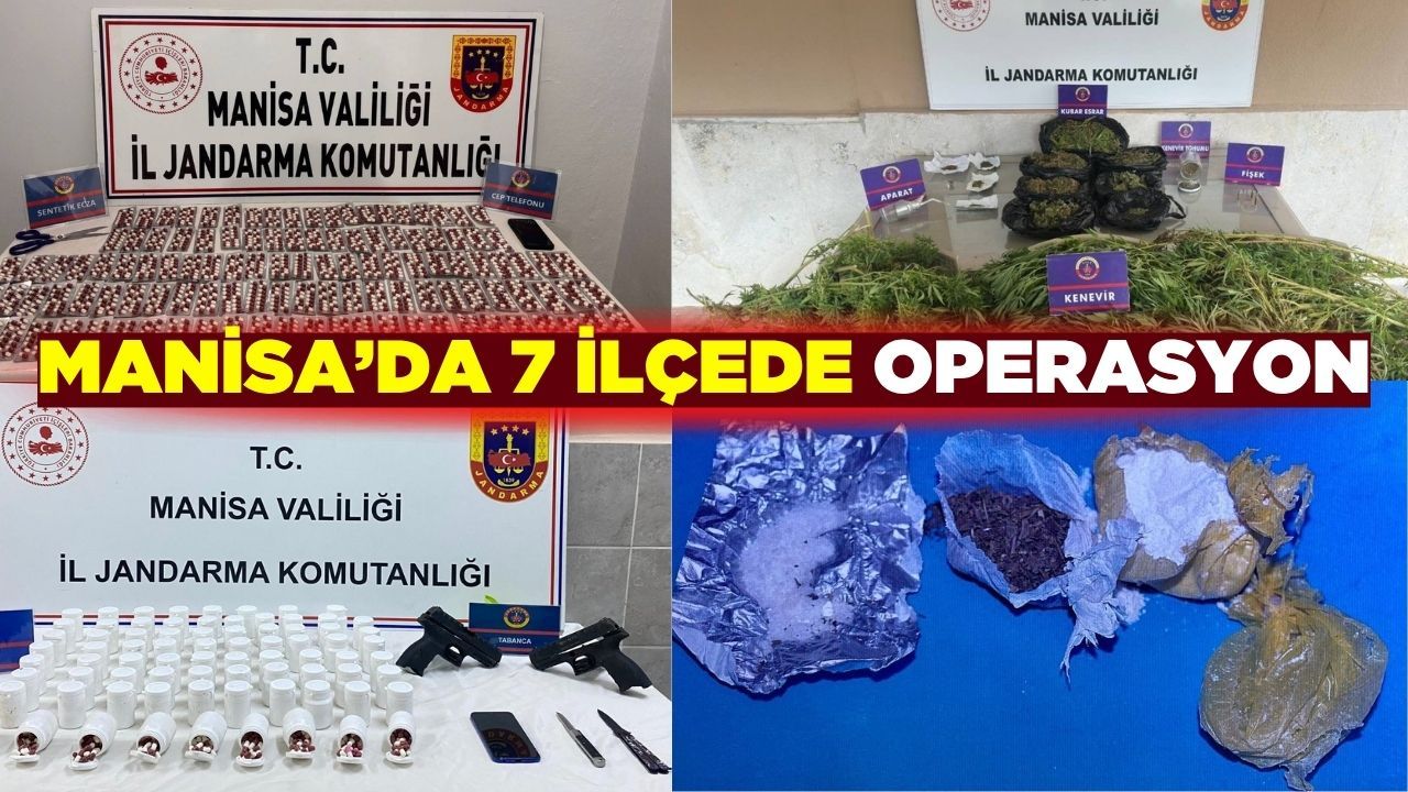 Şehzadeler, Yunusemre, Saruhanlı, Kırkağaç, Ahmetli, Salihli ve Alaşehir ilçelerinde yürütülen operasyonlarda şüphelilerin ev ve iş yerlerinde arama yapıldı. Yapılan aramalarda 12 bin 511 adet sentetik ecza hap, 2 bin 213 gram esrar, 59 gram yüksek değerli uyuşturucu, 2 tabanca ve 2 bıçak ele geçirildi.