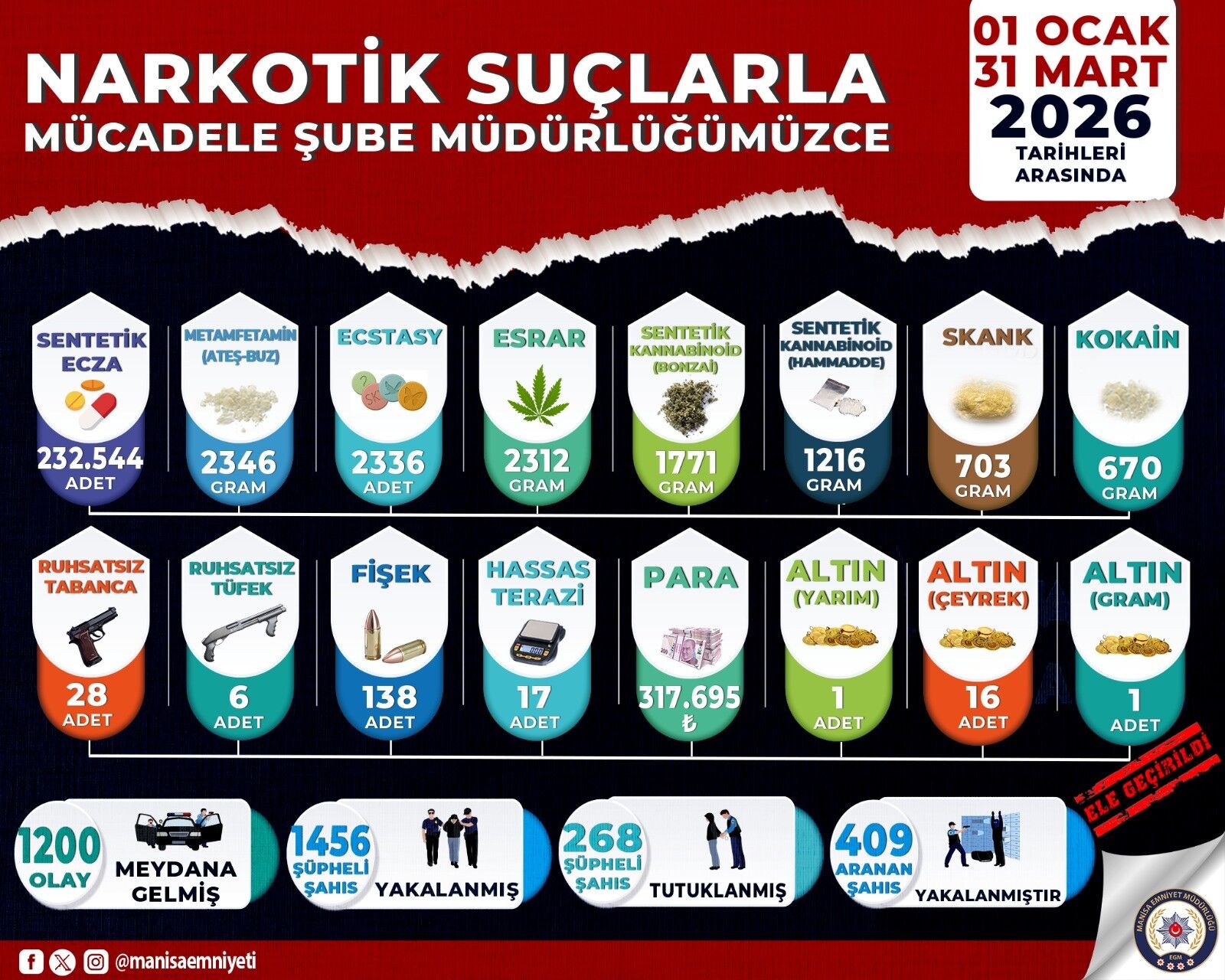 Manisa'da narkotik ekiplerinin 3 aylık çalışmasında çok sayıda uyuşturucu madde, silah ve para ele geçirilirken, 268 şahıs tutuklandı. Çalışmalarda bin 200 olay meydana gelirken, bin 456 şüpheli yakalandı, 268 şüpheli tutuklandı, 409 aranan şahıs ise yakalanarak adli makamlara teslim edildi.