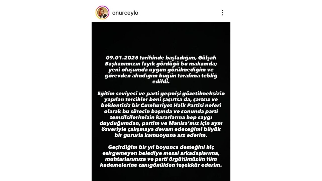 Şehzadeler Belediye Başkanı Gülşah Durbay’ın yönetimi altında 9 Ocak 2025 tarihinden bu yana Başkan Yardımcılığı görevini yürüten Onur Ceylan, belediyedeki yeni yapılanma süreci kapsamında görevinden alındı. Kararın kendisine tebliğ edilmesinin ardından bir açıklama yayınlayan Ceylan, hem veda etti hem de yeni görevlendirmelerdeki kriterlere dikkat çekti.