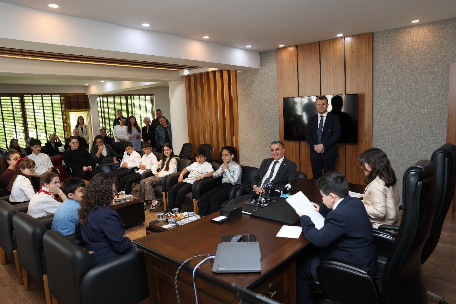 Şehzadeler Belediye Başkanı Hakan Şimşek, TBMM’nin açılışının 106. yıl dönümü ve 23 Nisan kutlamaları kapsamında anlamlı bir törene ev sahipliği yaptı. İstiklal İlkokulu 3. sınıf öğrencisi Janset Nare Oğuz ve Ahmet Tütüncüoğlu İlkokulu 4. sınıf öğrencisi Deniz Ege Kılınç, temsili olarak başkanlık koltuğuna oturarak Şehzadeler için hayallerini paylaştı.