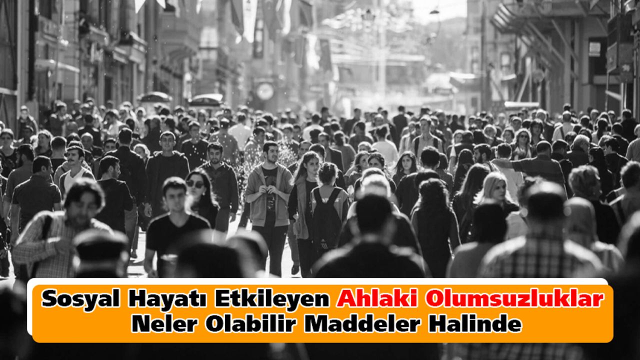 Sosyal hayatı etkileyen ahlaki olumsuzluklar, bireylerin birbiriyle ilişkilerini zedeler, toplumsal bağları zayıflatır ve genel olarak toplumun huzurunu ve düzenini bozar. İşte bu olumsuzluklardan bazıları: