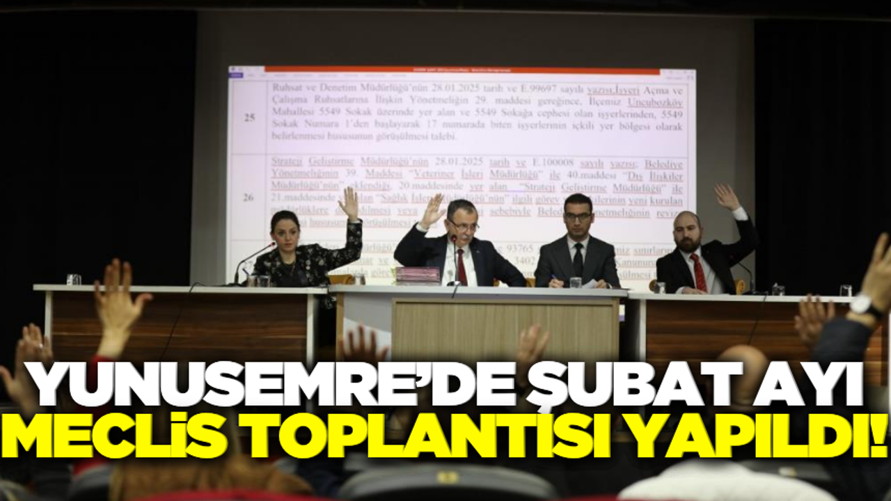 Yunusemre Belediye Meclisi, Millet Çarşısı Etkinlik Salonu’nda toplandı. Belediye Başkanı Semih Balaban başkanlığında yapılan şubat ayı toplantısı 2 oturum halinde gerçekleştirildi. 38 maddenin görüşüldüğü toplantıda denetim komisyonunda Ensar Günaydın’dan boşalan koltuğa Mertcan Üreten seçildi. Toplantıda imar planında yapılan revizyonlar da görüşülürken; bu konuda ortak akılla bir çalışma yürütüldüğüne dikkat çekildi.