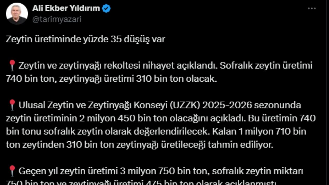 Tarım Yazarı Ali Ekber Yıldırım, Ulusal Zeytin ve Zeytinyağı Konseyi (UZZK) tarafından açıklanan 2025-2026 sezonu zeytin ve zeytinyağı rekolte verilerini değerlendirdi. Ali Ekber Yıldırım, "Zeytin üretiminde yüzde 35 düşüş var Zeytin ve zeytinyağı rekoltesi nihayet açıklandı. Sofralık zeytin üretimi 740 bin ton, zeytinyağı üretimi 310 bin ton olacak. Ulusal Zeytin ve Zeytinyağı Konseyi (UZZK) 2025-2026 sezonunda zeytin üretiminin 2 milyon 450 bin ton olacağını açıkladı.